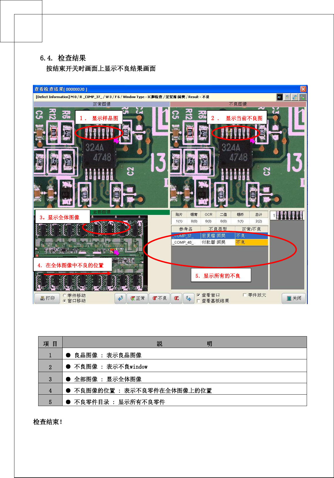 35 图 1.3 单击 将上下移动 不良列表 ,FRAME 也将会跟随着改变到不良 PART 的位置 , 此时用户可以在 程 序中对 PART 进行修改操作 · 单击此图际 , 标记当前 PART 为良品 . · 单击此图际 , 标记当前 PART 为不良 . · 单击此图际 , 将显示图 1.4 图 1.4 图 1.4 相对应的翻译表 : 显示模数 窗口数 元件数 检查窗口总数 直通率:良板 / 总板数 ( 百分比 ) 直通率:良好模…