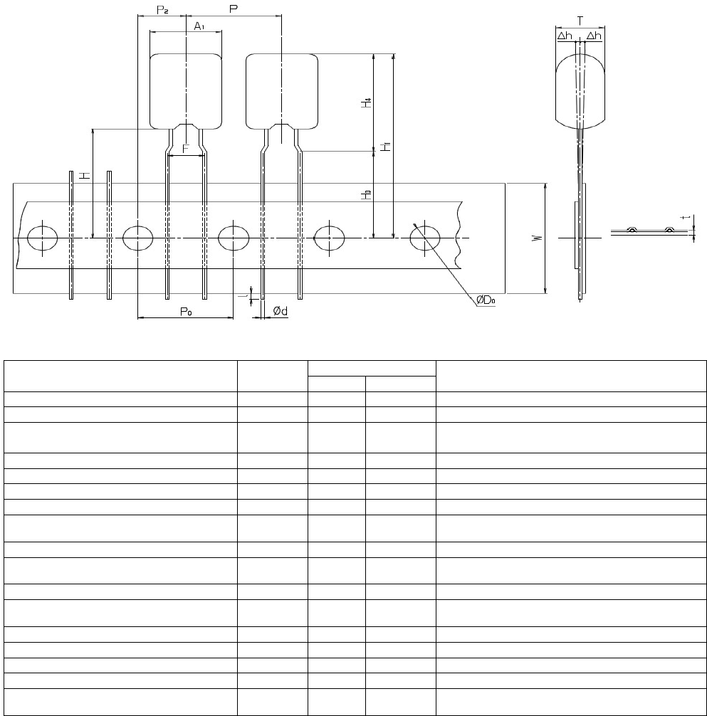 RL132 2012.0903 - 22 - 2) 陶瓷电容器 ( 成型引脚 ) 尺寸 (mm) 内容 记号 数值 容许范围 备注 元件直径 Ø D 13.0 最大 元件厚度 T 3.5 最大 引脚线直径 Ø d 0.6 ±0.05 软铜线是 Ø 0.6 mm 硬铜线和 CP 线是 Ø 0.5±0.05 mm 元件间距 P 12.7 ±1.0 孔间距 P 0 12.7 ±0.3 累积间距误差 = 1.0mm /20 间距 从孔中心到引脚…
