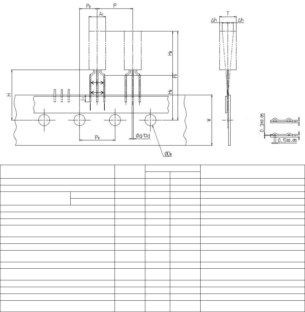 RL132 2012.0903 - 28 - 8) 电阻器 (B) 尺寸 (mm) 内容 记号 数值 容许范围 备注 元件直径 Ø D 4.5 最大 引脚线直径 Ø d 0.6 ±0.05 软铜线是 Ø 0.6 mm 硬铜线和 CP 线是 Ø 0.5±0.05 mm 元件间距 P 12.7 ±1.0 孔间距 P 0 12.7 ±0.3 累积间距误差 = 1.0mm /20 间距 从孔中心到元件中心部为止 P 2 6.35 ±1.3 引脚…