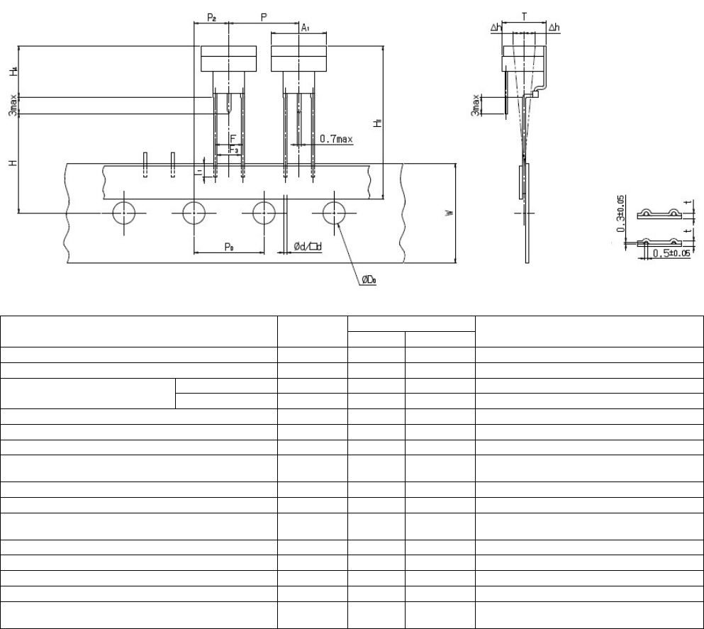 RL132 2012.0903 - 32 - 12) 微调电容器 尺寸 (mm) 内容 记号 数值 容许范围 备注 元件宽度 A 1 10 最大 元件厚度 T 6.5 最大 圆形引脚 Ø d 0.5 ±0.05 引脚线直径 方形引脚 □ d *0.5 ±0.05 *(0.5±0.05) x (0.3±0.05) 元件间距 P 12.7 ±1.0 孔间距 P 0 12.7 ±0.3 累积间距误差 = 1.0mm /20 间距 从孔中心到元…