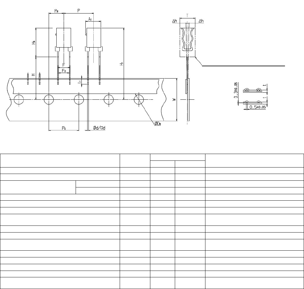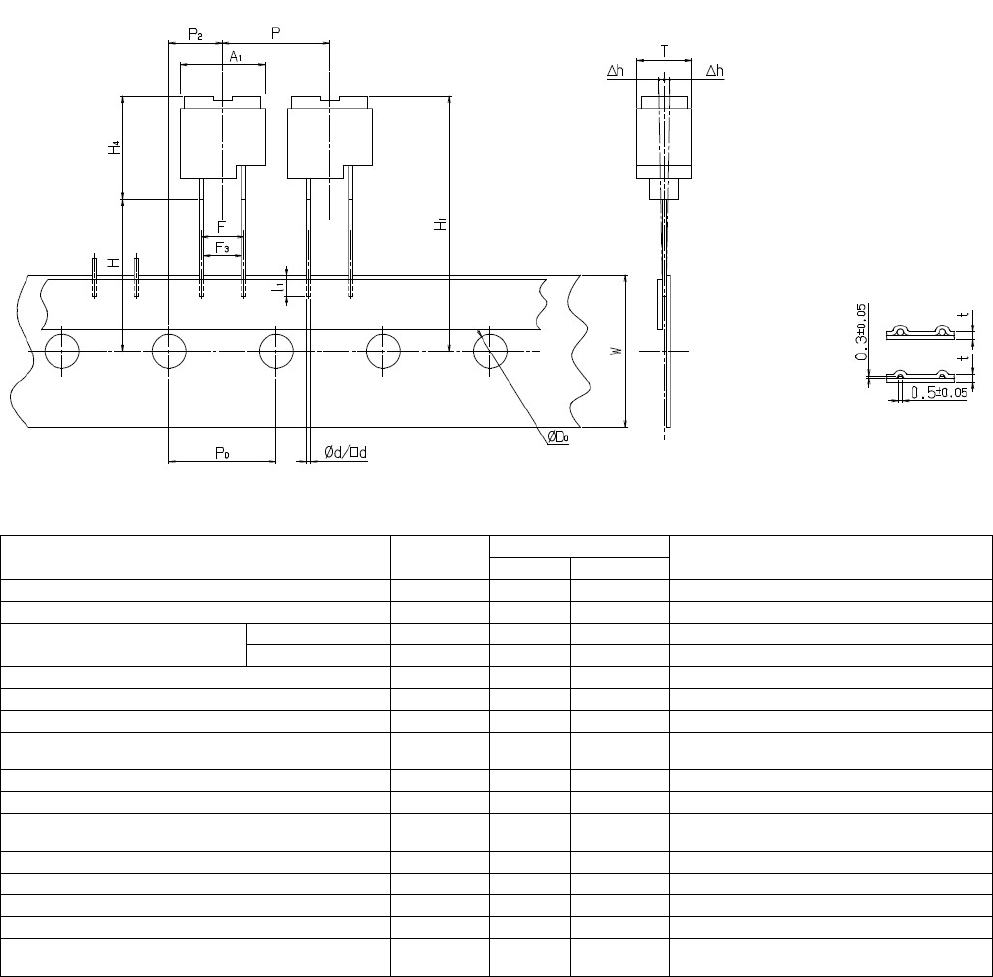 RL132 2012.0903 - 33 - 13) 保险丝夹子 尺寸 (mm) 内容 记号 数值 容许范围 备注 元件宽度 A 1 10 最大 元件厚度 T 6.5 最大 圆形引脚 Ø d 0.5 ±0.05 引脚线直径 方形引脚 □ d *0.5 ±0.05 *(0.5±0.05) x (0.3±0.05) 元件间距 P 12.7 ±1.0 孔间距 P 0 12.7 ±0.3 累积间距误差 = 1.0mm /20 间距 从孔中心到元…