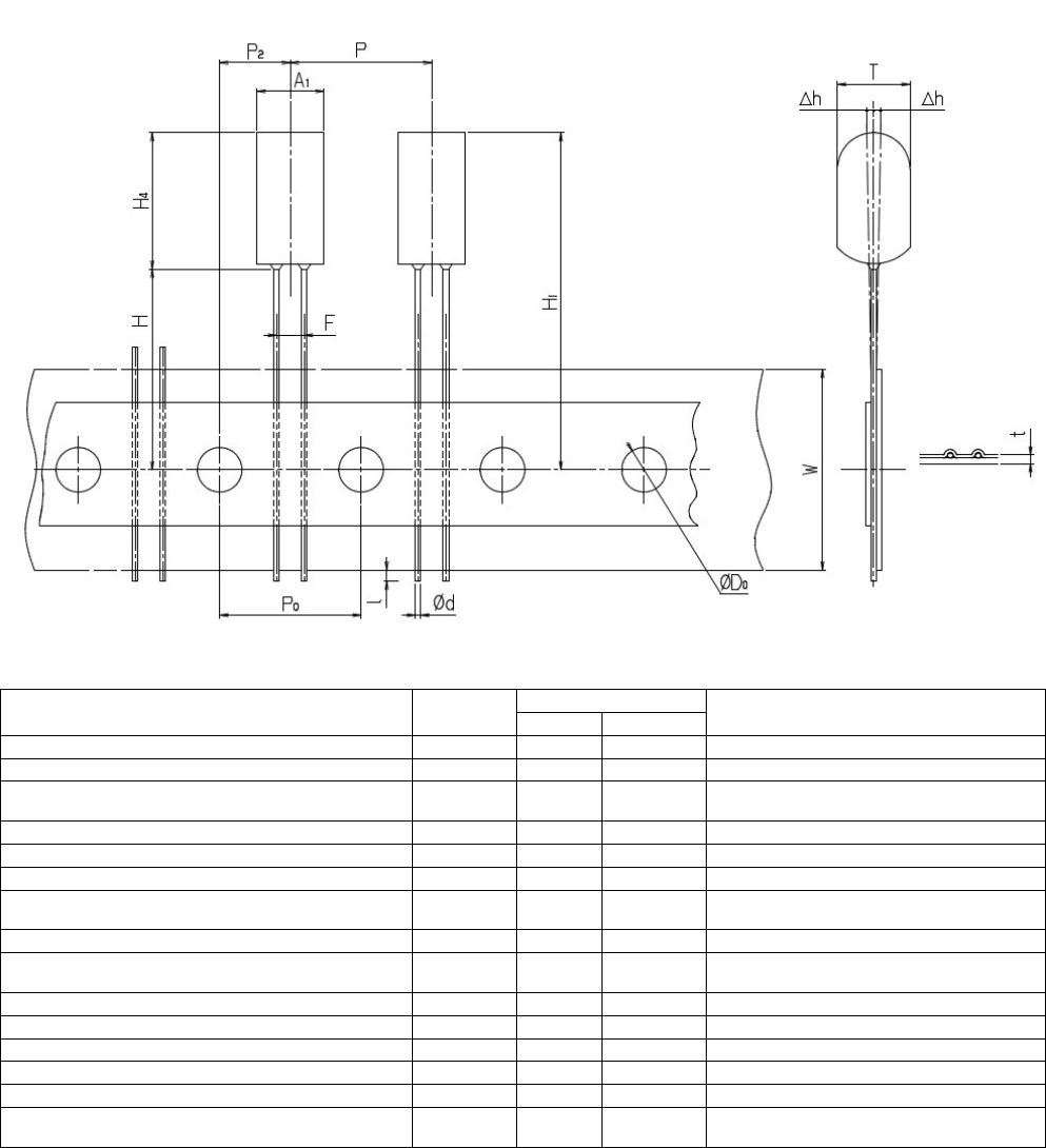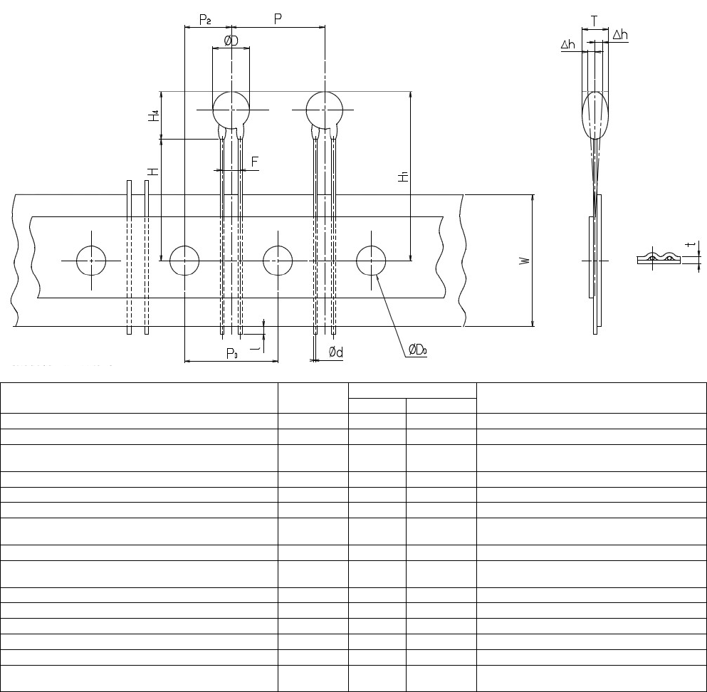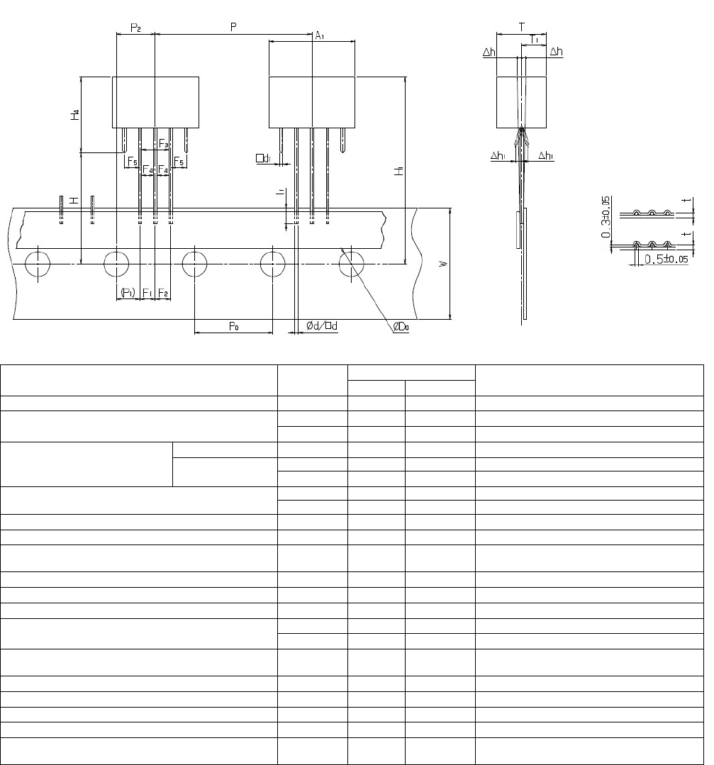 RL132 2012.0903 - 38 - 18) 陶瓷电容器 尺寸 (mm) 内容 记号 数值 容许范围 备注 元件直径 Ø D 13 最大 元件厚度 T 3.5 引脚线直径 Ø d 0.6 +0.06 -0.05 元件间距 P 12.7 ±1.0 孔间距 P 0 12.7 ±0.3 累积间距误差 = 1.0mm /20 间距 从孔中心到元件中心部为止 P 2 6.35 ±1.3 引脚间距离 F 5.0 +0.5 -0.2 引脚尖端…