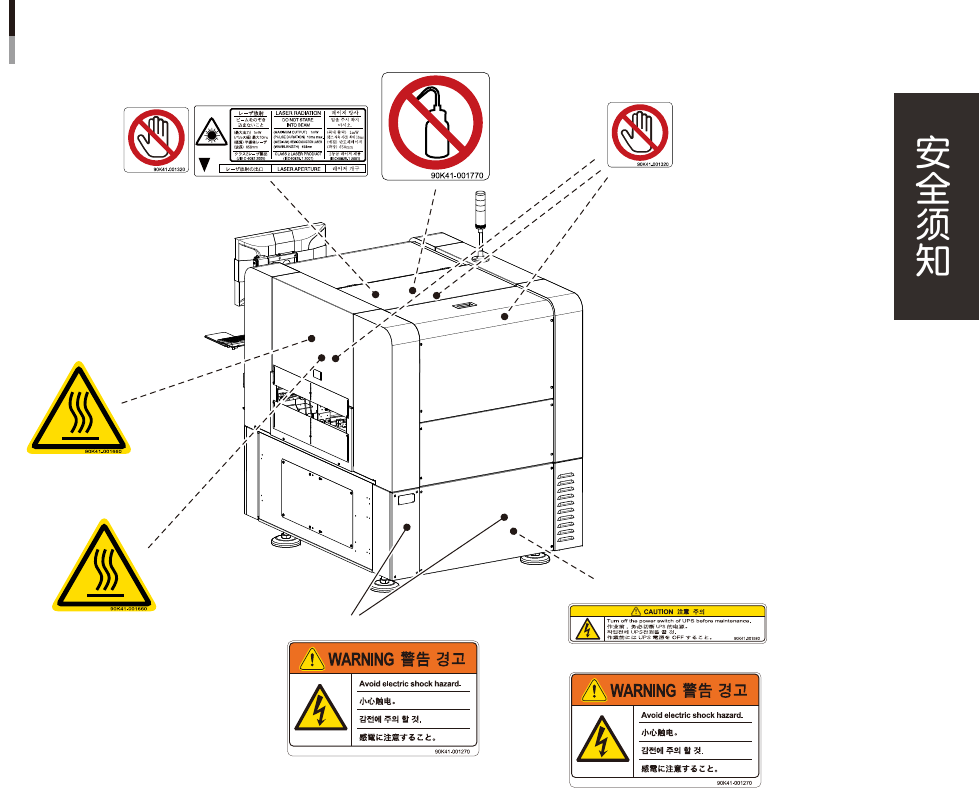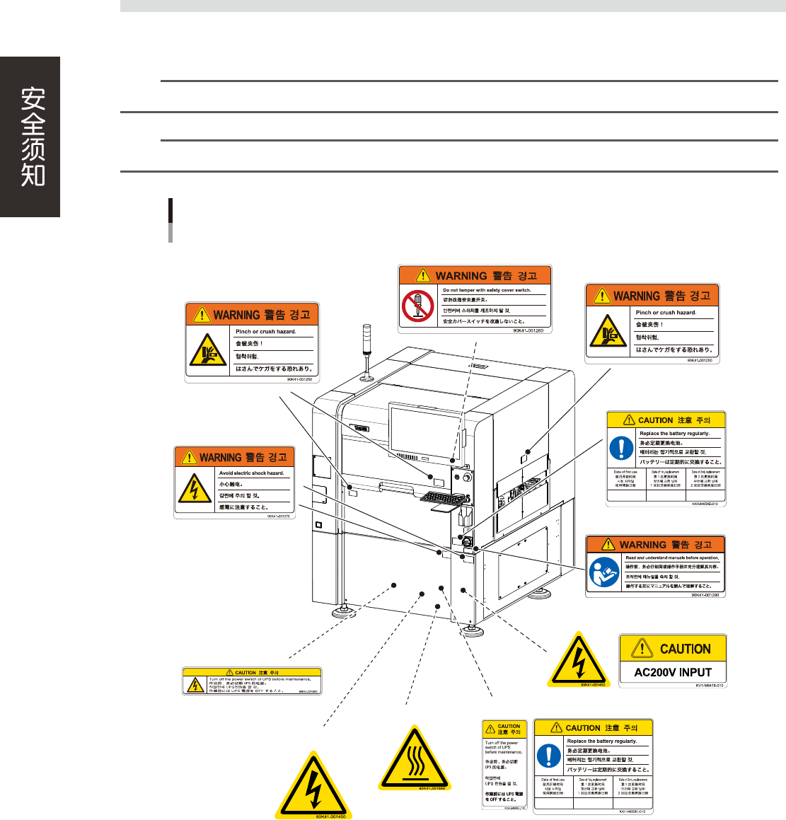 为了安全使用机器,如下图所示,在设备各个部位张贴了警告标贴,务必严格遵守标贴指示。此外,关于本节所