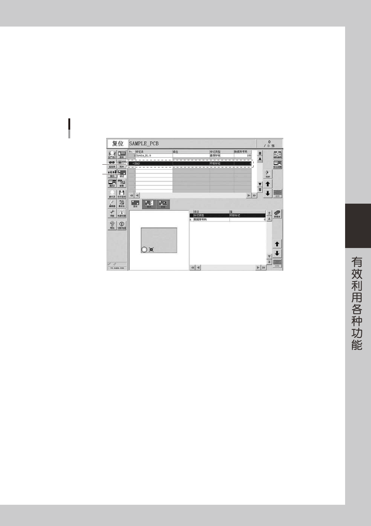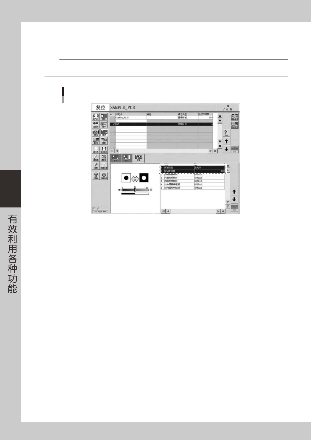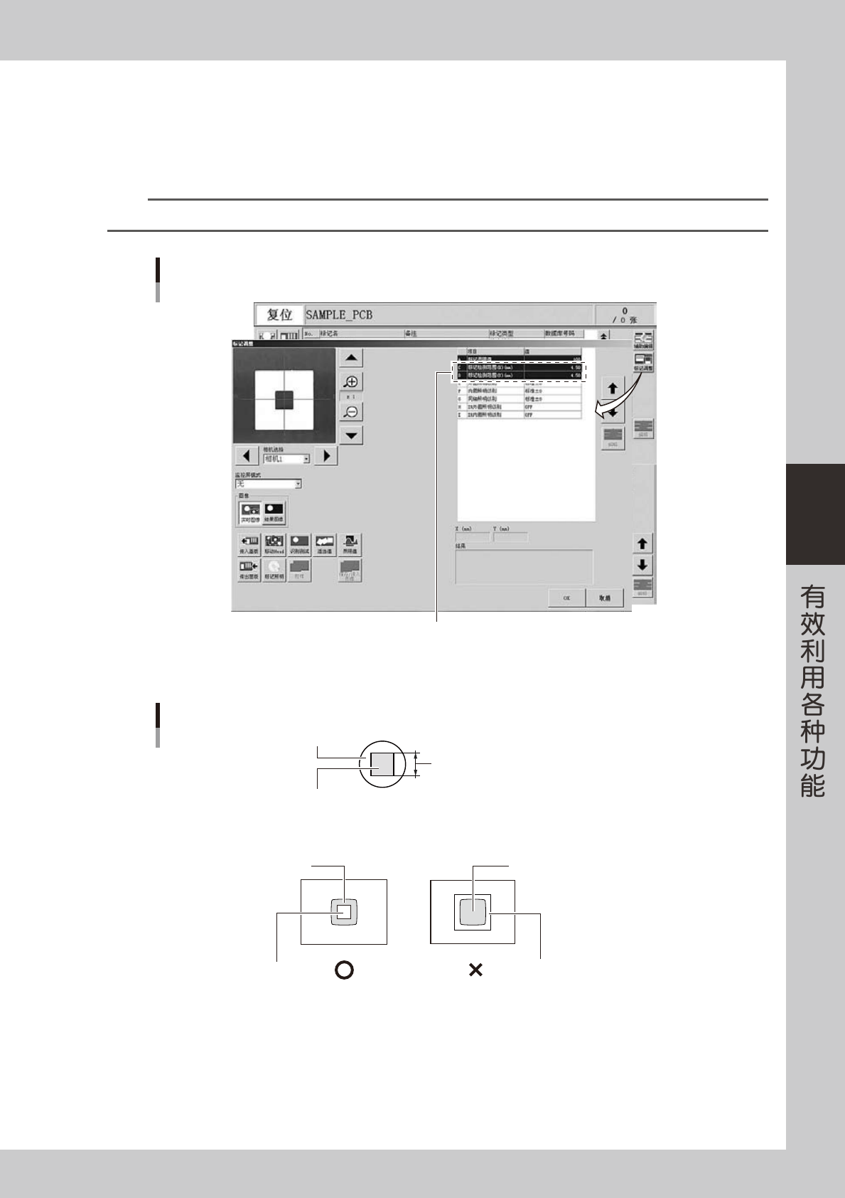 4-6 4 3 输入图像处理信息。 在标记画面选择“识别”选项卡, 选择“A. 表面类型” 。标记比基板亮时设置为“反光体” , 暗时设置为“非 反光体” 。 参考 “B. 标记界限值” ,通过辅助调整求取适当值。在此使用默认值即可。 坏板标记功能只判断标记有无,标记本身的形状大小等不在判断范围内。 标记信息画面 表面类型与标记界限值 26448-P2-00 4 将基板固定在传送轨上。 按 [ 标记调整 ] 按钮,打开标记调整画面,按 …