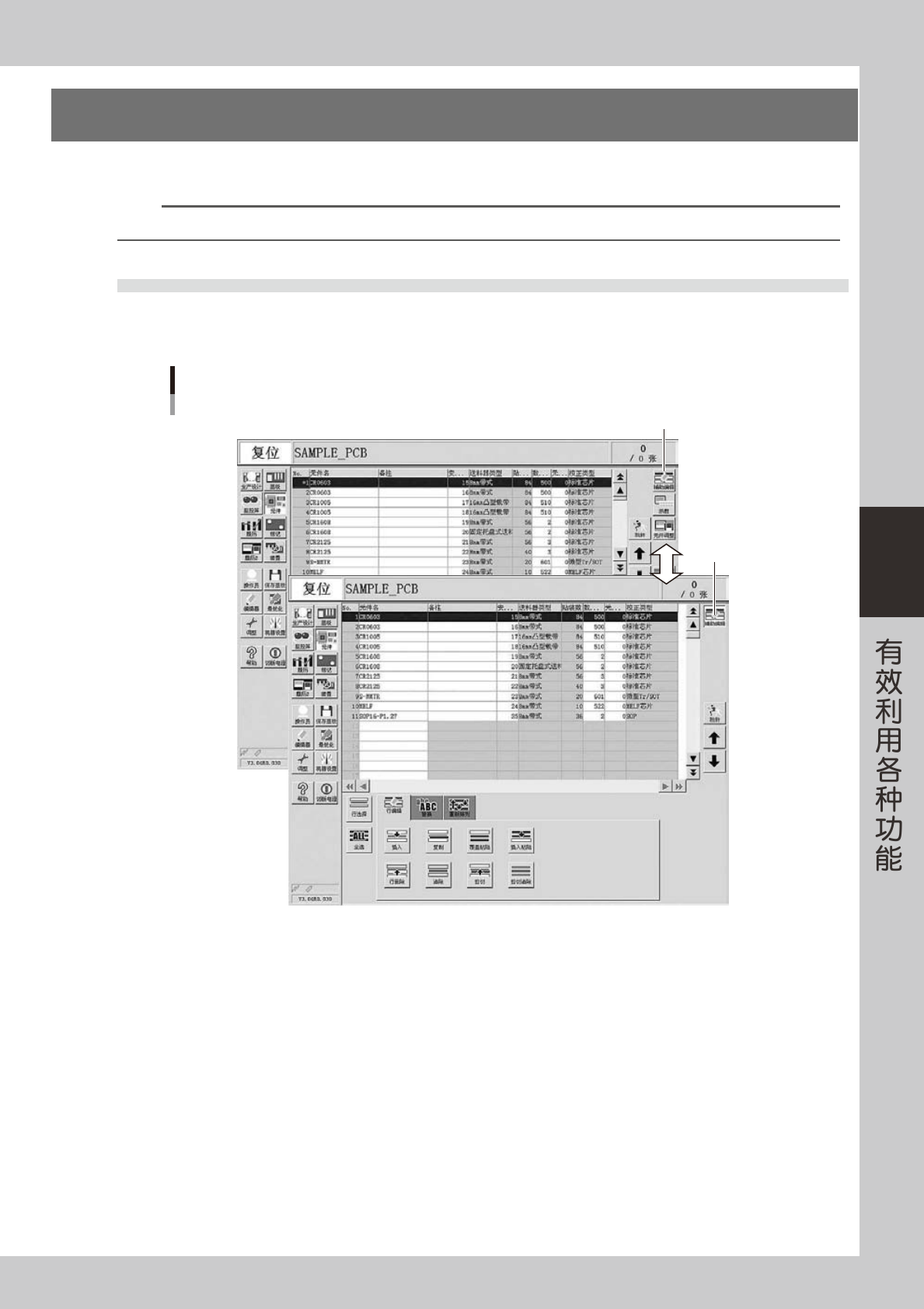 4-21 4 4. 辅助编辑功能 辅助编辑功能是对选择的范围进行行编辑、查找与替换的功能。 n 要点 合并基板程序时,如果在 [ 基板 ] 信息画面使用辅助编辑,必须按轨道切换按钮切换至想要操作的轨道后再操作。 4.1 切换至辅助编辑画面 按元件画面右上方的 [ 辅助编辑 ] 按钮, 将画面切换至编辑画面, 显示查找、 替换等选项卡。想要返回通常画面时, 只需再次按 [ 辅助编辑 ] 按钮即可。 [辅助编辑]按钮 按钮下沉 “辅助…