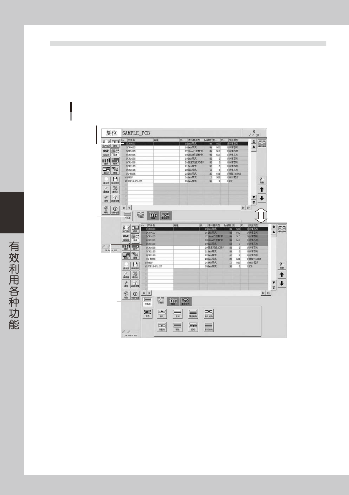 在表格中以行为单位指定选择范围时,使用 [ 行选择 ] 按钮和 [ 全选 ] 按钮。选择的行呈反色显示。