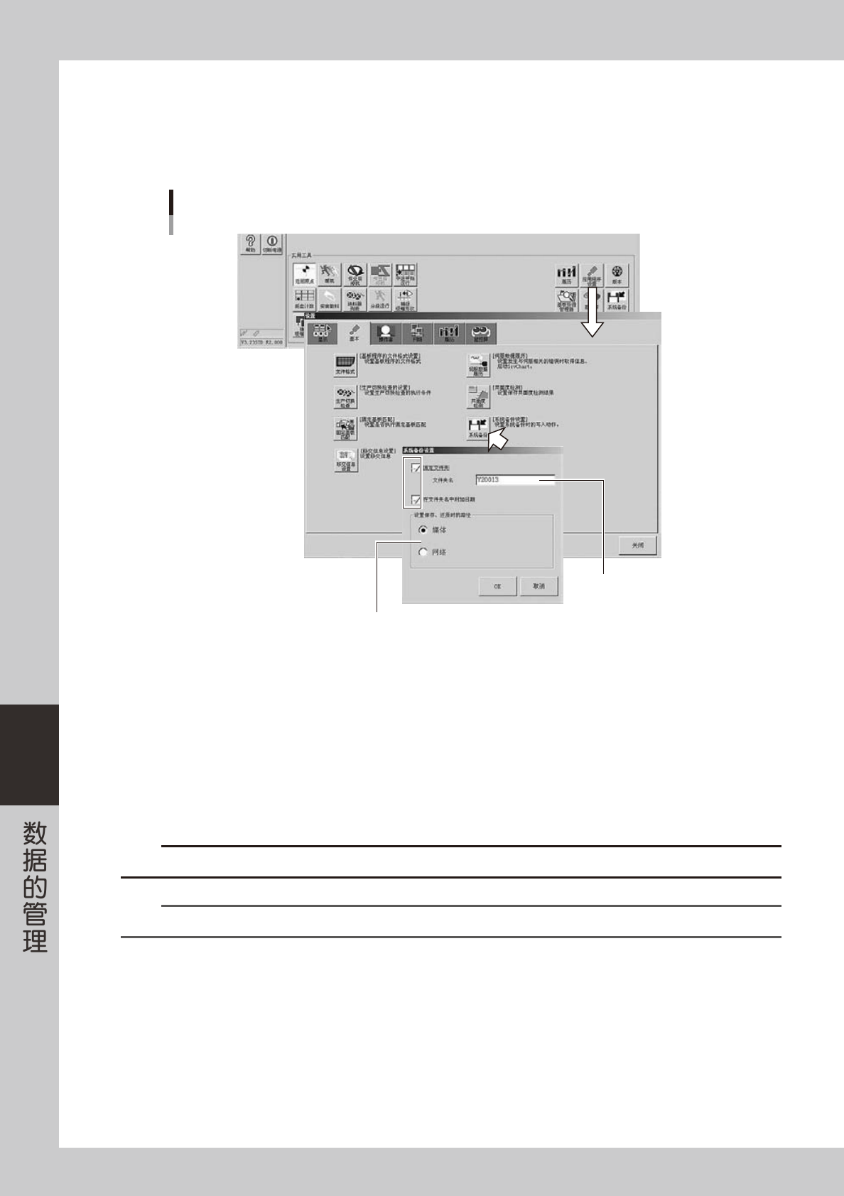 所备份的数据,在脱机软件中登录机器时使用。此外,在升级应用软件之前或更改机器设置之前,为了安全也可以进行