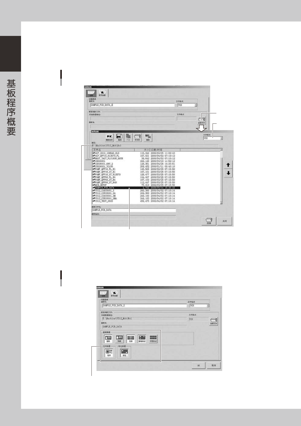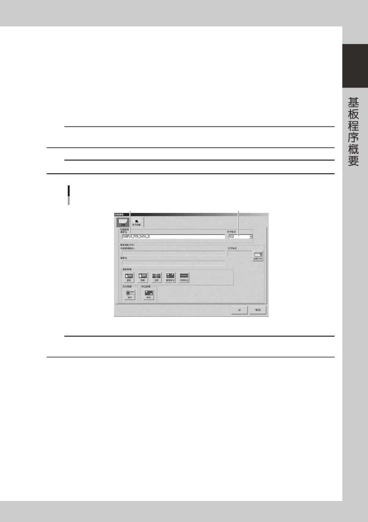 1-5 1 ■ 下面,介绍“2. 利用已登录的基板程序”的方法。 1 按生产设计画面的 [ 创建基板 ] 按钮。 打开“创建基板”对话框。 2 在“复写创建”选项卡的基板名输入框中,输入基板名。 选择文件格式,用键盘输入基板名。 ‧ 文件格式为 VIOS 时,可用半角英文和数字在 20 字以内输入。 ‧ 文件格式为 YGX 时,可用半角英文和数字在 260 字以内输入,但状态区可显示的字数只有 40 字左右。 n 要点 基板名可使用的…
