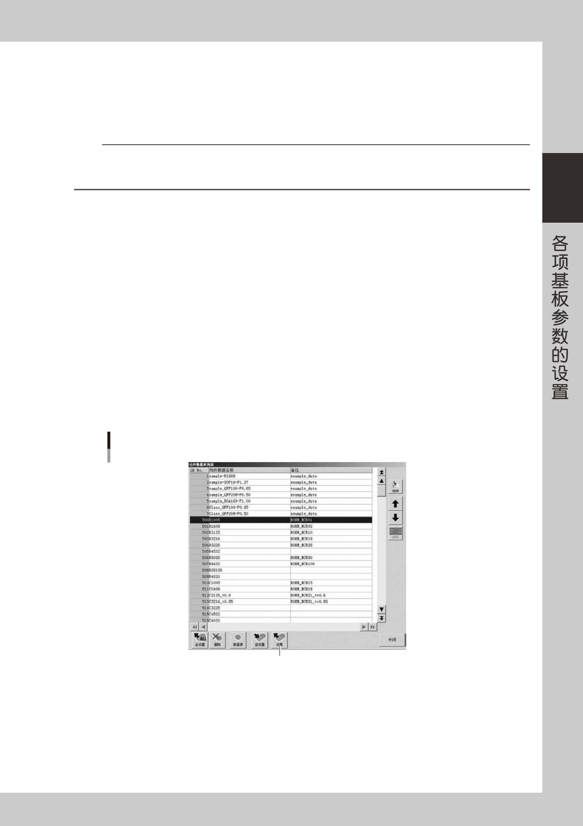 想要从数据库复制参数值时,按 [ 数据库 ] 按钮。“元件数据库列表”画面显示后,选择想要复制的数据,按 [ 设置 ] 按钮进