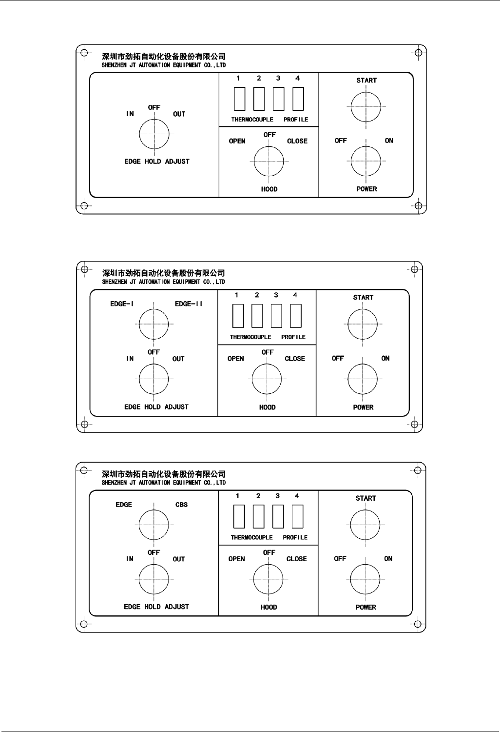 TEA 系列无铅回流焊机用户手册 安装与调试 3.2.2 机器调试 3.2.2.1 控制面板介绍 控制面板(单导轨回流焊) 控制面板(双导轨回流焊) 控制面板(单导轨 + 加中央支撑回流焊) - 1 7 - 9 9