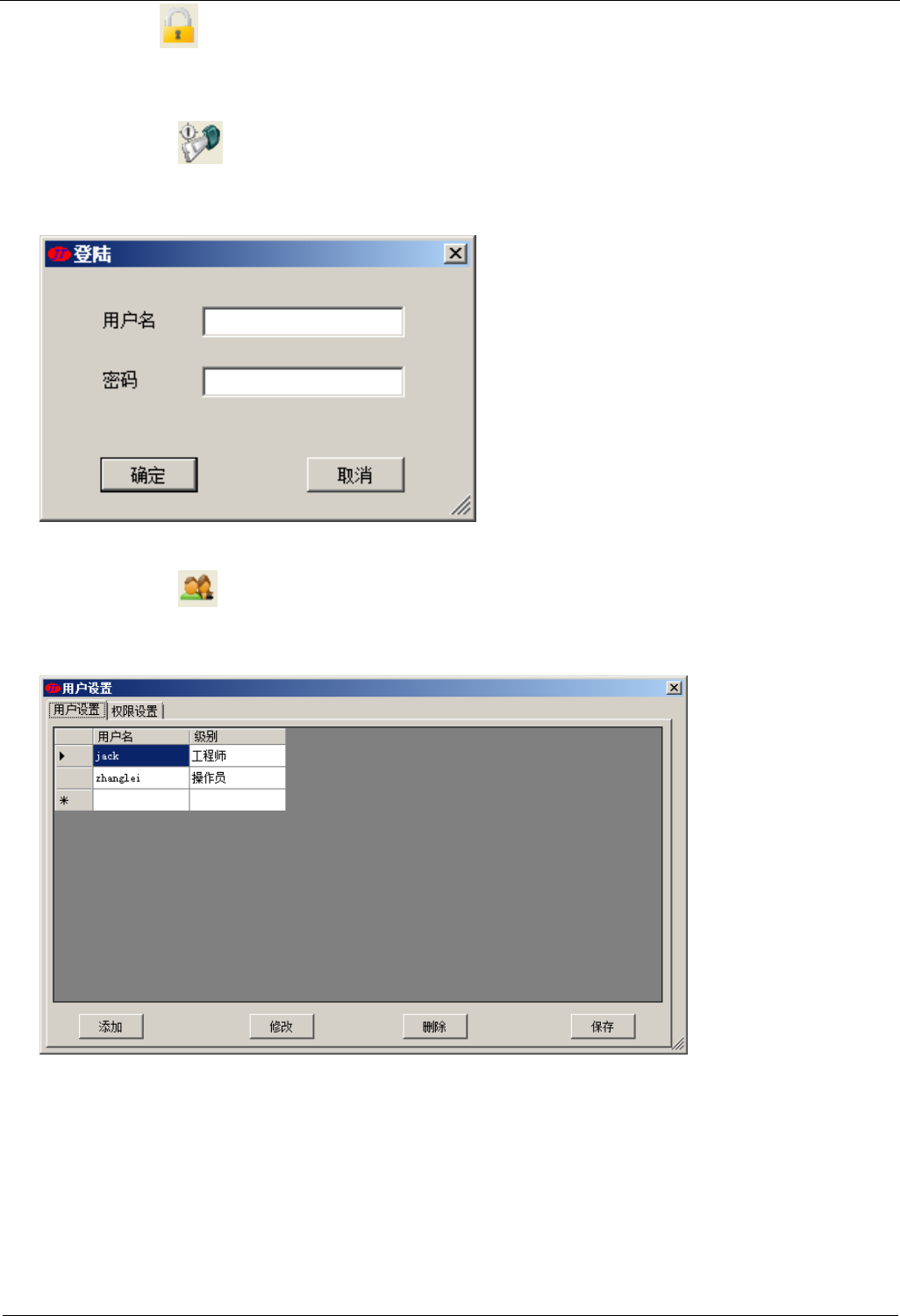 限栏中选择此用户所对应的权限,最后按“保存”键,这样每个用户都可具有不同的权限,设置更灵活。