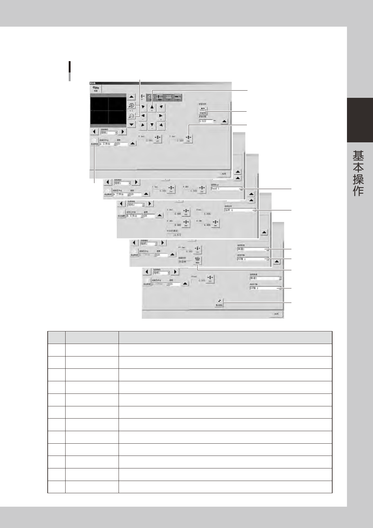 2-19 2 5. [ 移动轴 ] 按钮 用手动操作移动轴时使用。按 [ 移动轴 ] 按钮后, 显示移动轴画面, 使用箭头按钮或按 [PTP] 按钮, 输入数值, 即可使轴移动。 “移动轴”画面 1 2 5 4 3 10 6 7 8 9 11 12 26206-N9-00 按钮名 功能 1 放大、缩小 ( +、- ) 放大、缩小图像 (16 倍〜 1/16 倍 )。 2 标记照明 可以手动调节标记照明。不影响数据。 3 箭头按钮 按箭头…