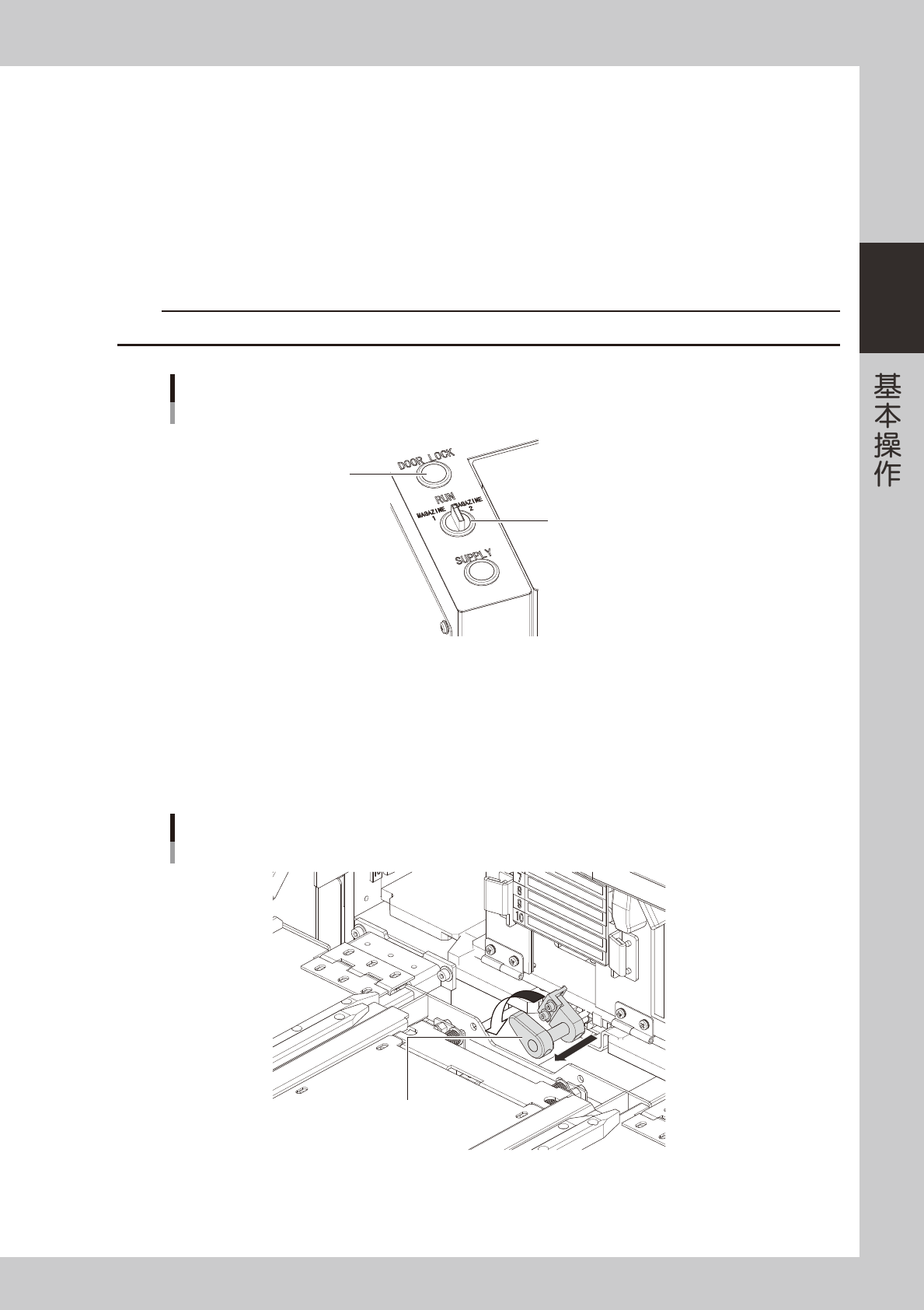 2-47 2 4.2.3 在运行中更换载料箱或载盘 cATS 料车,在贴片机运行过程中也可以更换当前没有使用的载料箱或载料箱中的载盘。 下面,介绍更换载料箱与载盘的方法。 ■ 更换载料箱时 1 选择载料箱。 将柜门开关旋至“MAGAZINE 1”或“MAGAZINE 2” ,选择载料箱。 DOOR LOCK 指示器熄灯之后,柜门的锁定状态被解除。 c 注意 在自动运行过程中,如果选择当前正在使用的载盘所在的载料箱,贴片机会报错停机。 柜…