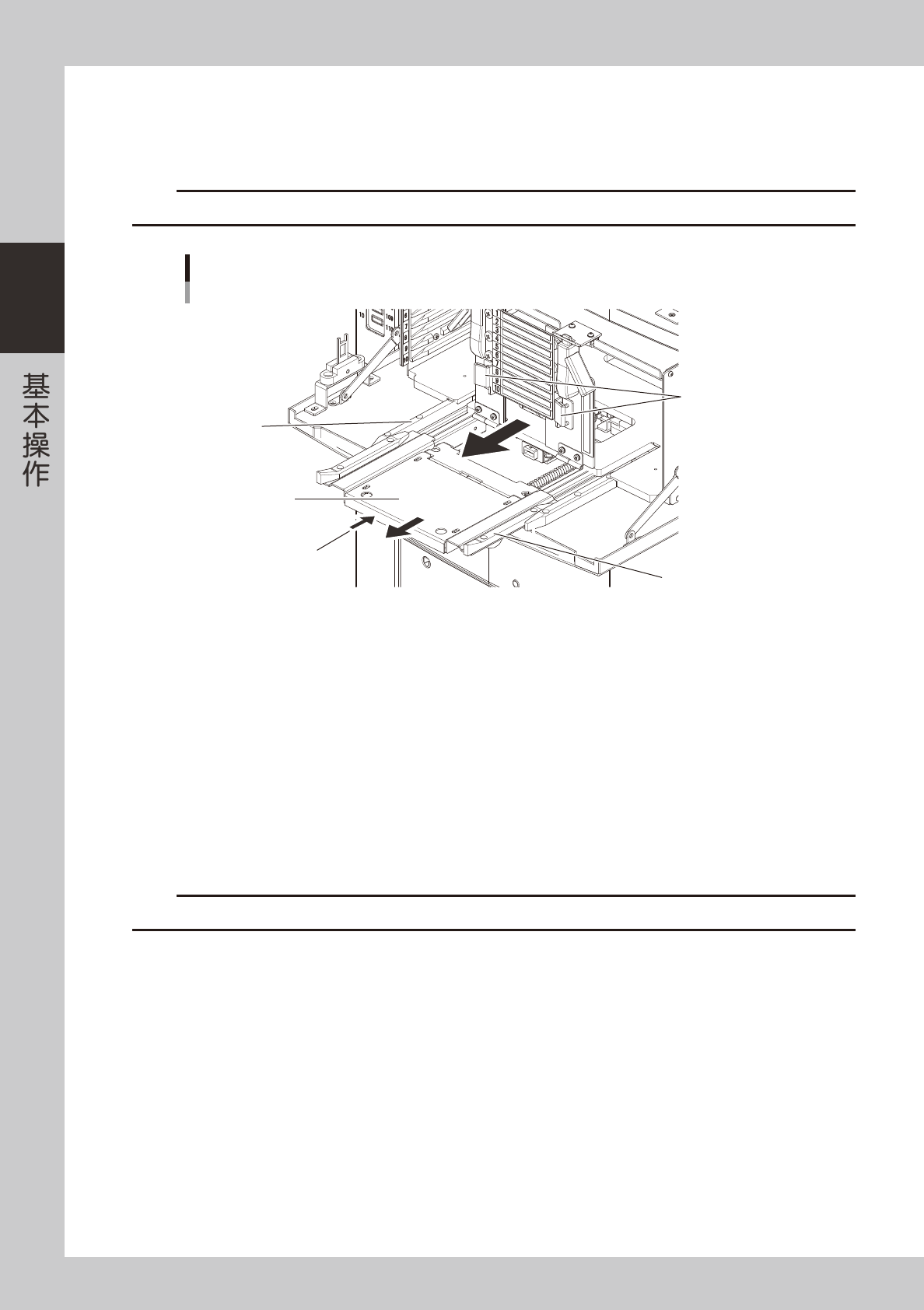 拉出载料箱之前,请务必先拉出内侧导轨板以便加长导轨。否则,拉出载料箱时,载料箱可能会跌落。