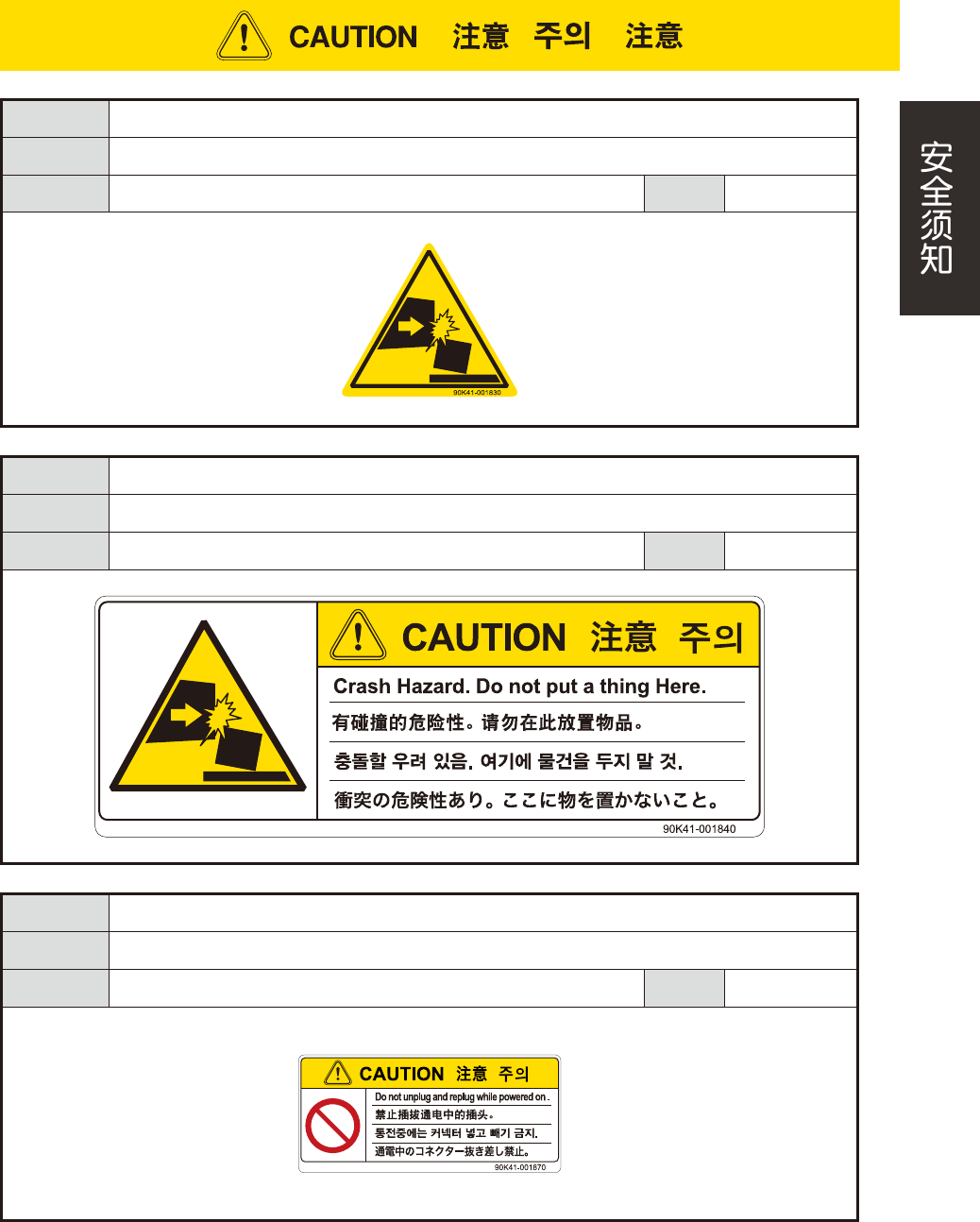 xxiv 危险结果 可能会导致设备被损坏 ( 与贴装头发生碰撞等 )。 安全防范 确认一次性换料车的盖板上是否放置有物品。 对象 一次性换料车 (YSM40) 警告阶段 生产准备 危险结果 载带与贴装头接触,可能会导致设备被损坏。 安全防范 从送料器安装位置拔出送料器时,必须完全拔出后再插回。 对象 Z:LEX(YSM20/YSM20W)、YSM40/YSM40R 警告阶段 生产准备 危险结果 直接在元件补充台上补充元件,可能会使载盘滑…