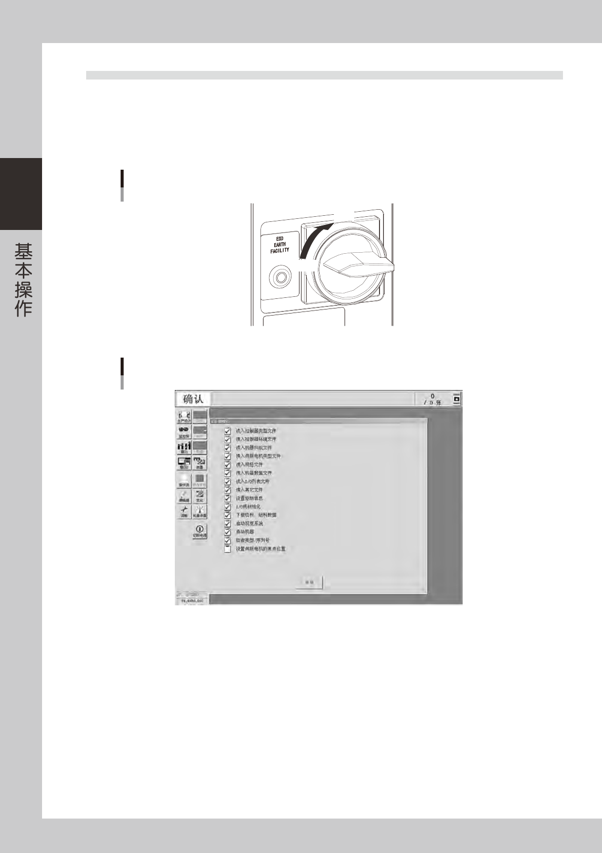 确认指示灯中的红色指示灯已熄灯,操作画面左上角 ( 状态区 ) 的紧急停机显示已消失。