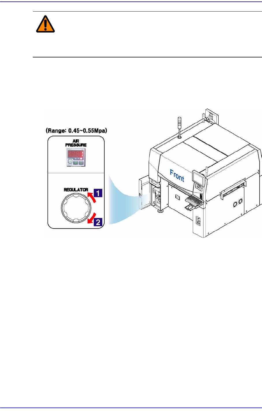 Samsung Componen t Placer SM411/411N Operation Training xvi 경 고 비상정지상태에서는 장비의 모든 서보모터에 대한 전원이 OFF 가 되지만 , 그 외에 전원부에는 전원이 인가된 상태입니다 . 전원 이 인가된 부위에 대한 에러조치시 주의하십시오 . 압력조절기 (Regulator) 장비에 공급되는 공압의 크기를 조절하는 장치입니다 . 시게방 향으…