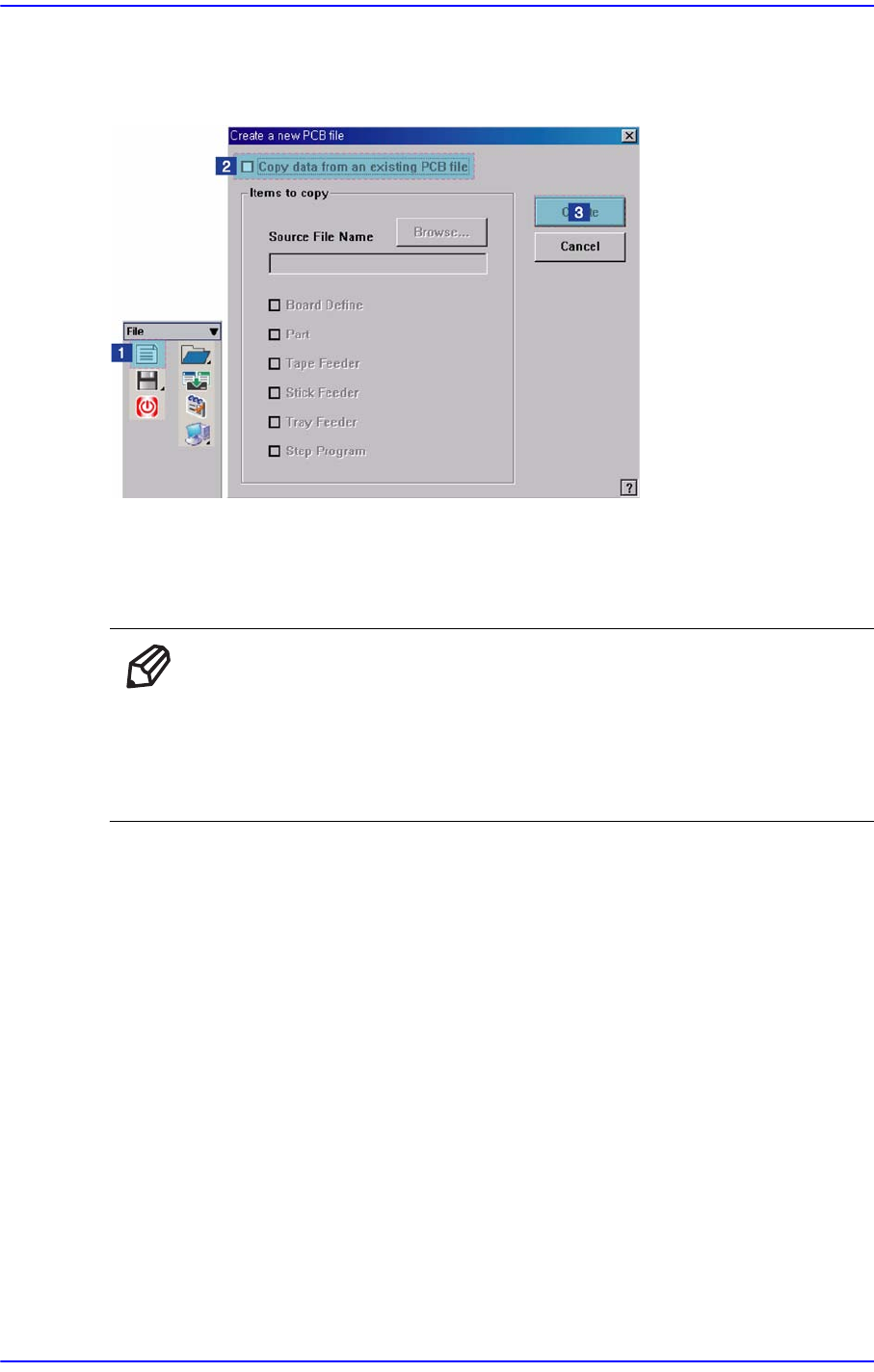 2-2 Samsung Componen t Placer SM411/411N Operation Training 2.1.2. 따라하기 2.1.2.1. New ( 신규파일 생성 ) <Create> 버튼 신규 PCB 파일을 작성합니다 . 복사할 원본 파일을 지정하지 않은 경우는 <Items to Copy> 체크박스 영역의 모든 데이터가 디폴트 상태인 파일을 작성합니다 . 메 …
