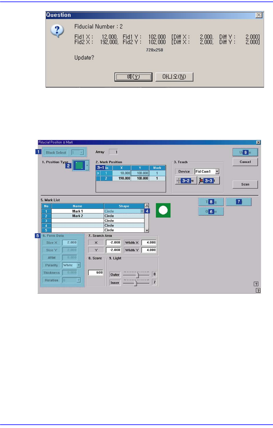 3-9 MMI 따라하기 Ⅱ <Polarity> 콤보박스 Fiducial Mark 의 색상을 선택합니다 . 선택가능한 색상은 다음과 같습니다 . White: 주변보다 Mark 가 밝게 보이는 경우입니다 . Black: 주 변보다 Mark 가 어둡게 보이는 경우입니다 . <Thickness> 에디트박스 Fiducial Mark 의 두께를 설정합니다 . 0 일때…