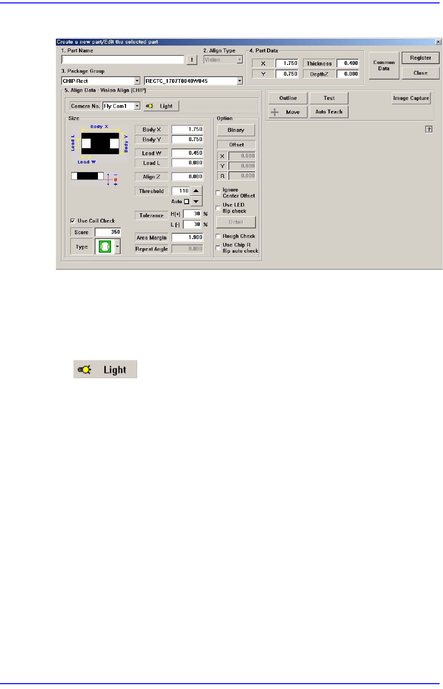 3-21 MMI 따라하기 Ⅱ 3.2.1. 새로운 부품 등록 <Camera No.> 콤보박스 부품을 인식할 카메라를 선 택합니다 . 선택 가능한 카메라는 다음과 같습니다 ; Fix Cam: Fix 카메라를 선 택합니다 . 티칭 용 도로만 활용됩니다 Fly Cam: Fly 카메라를 선택합니다 버튼 부품을 인식할 카메라의 조명을 설정합니다 . Body X/Y 부품의 B…