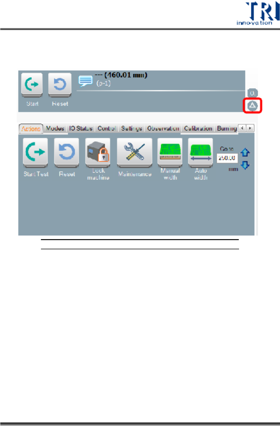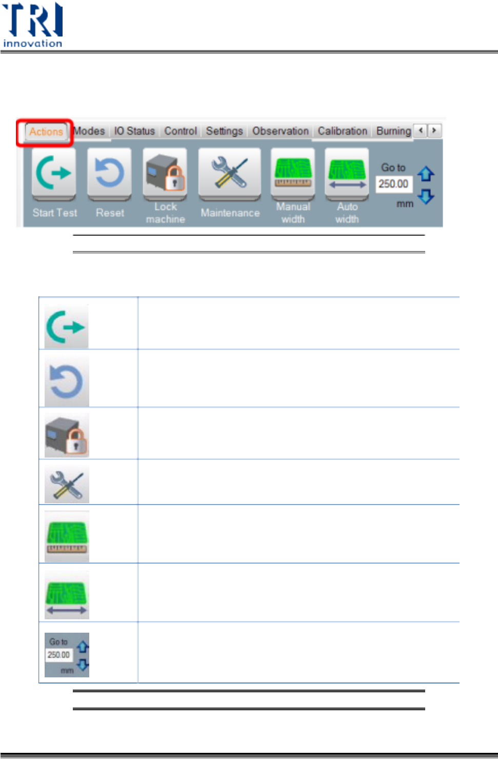 Test Research, Inc. 3.1 Actions 點擊 [Action] 可以改變 conveyor 的寬度與掃描電路板。 7: VPLC/ 控制工具列 圖 於 [Actions] 控制類別中 , 包含了 [Start Test], [Reset], [Lock Machine], [Maintenance], [Manual Width], [Auto Width], 與 [Go to] 等選項。 開始掃板。 復…