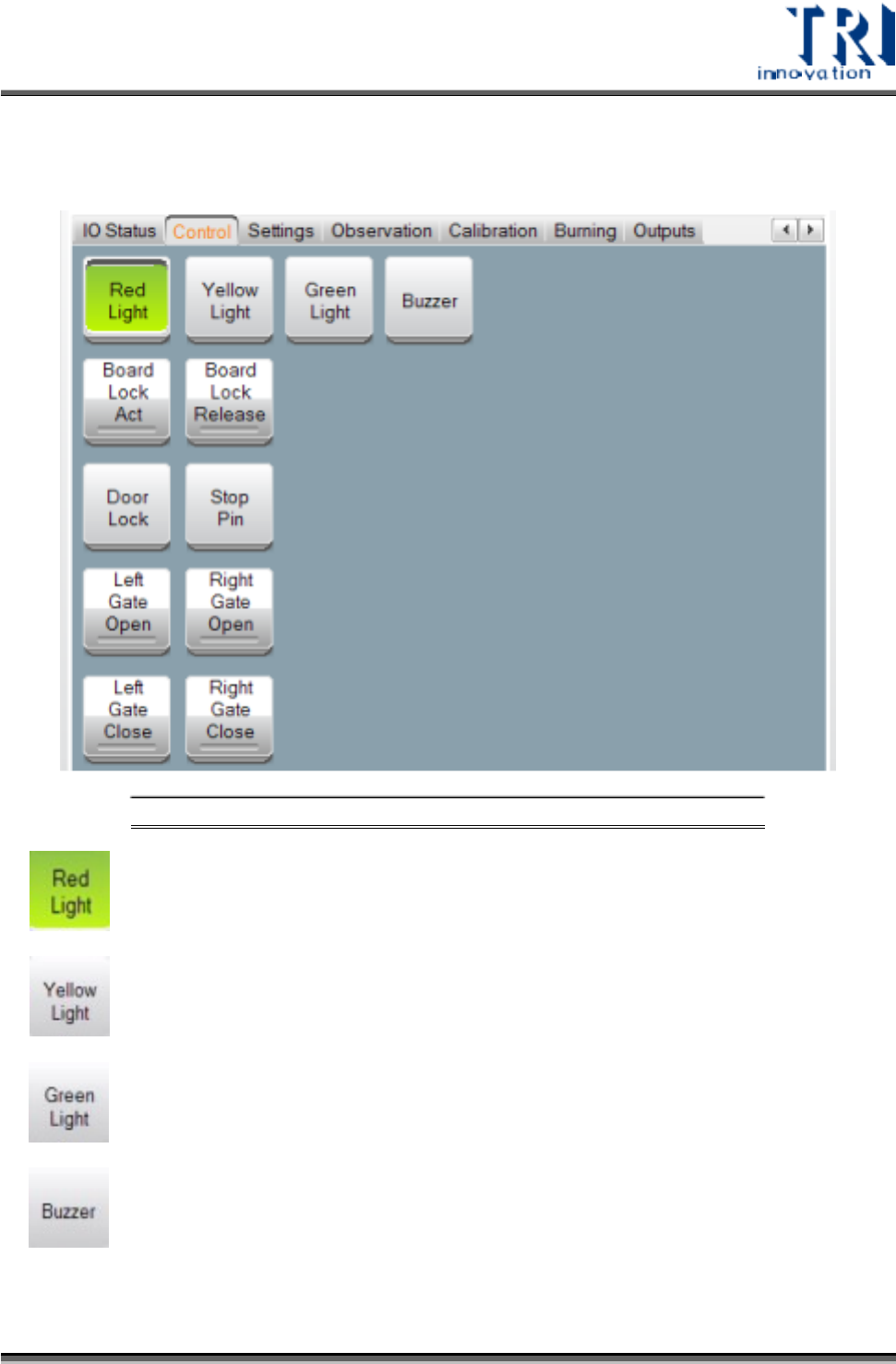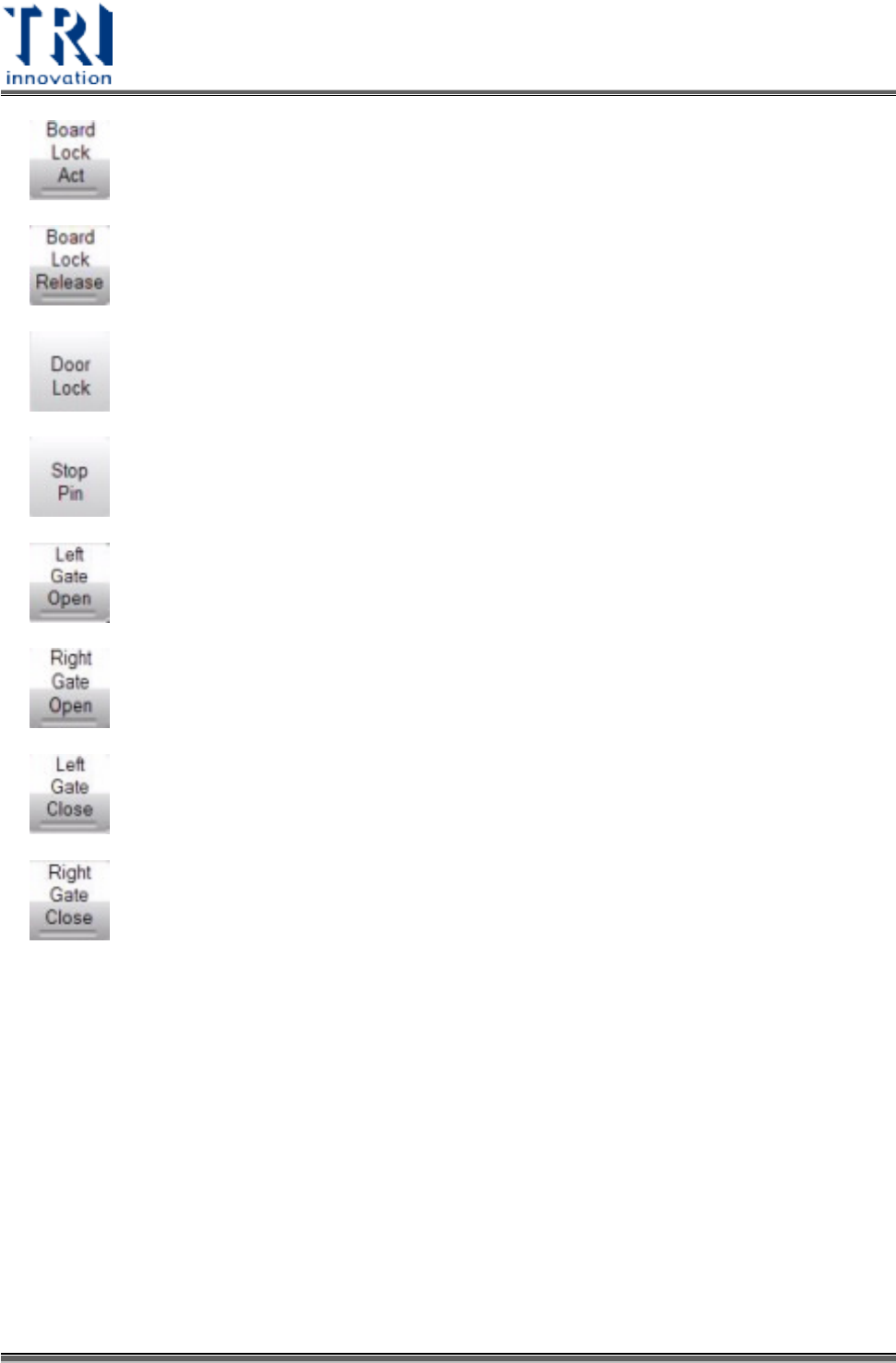 Test Research, Inc. :使用夾板裝置夾住受測板。 :讓夾板裝置放開受測板。 :鎖住前後門。 :將 stop pin 伸出 (TR7600SIII 及 TR7680 不會用到此功能 ) 。 :開啟左閘門。 :開啟右閘門。 :關閉左閘門。 : : 關閉右閘門。 14 TR7600SIII 系列 使用手冊 – 硬體