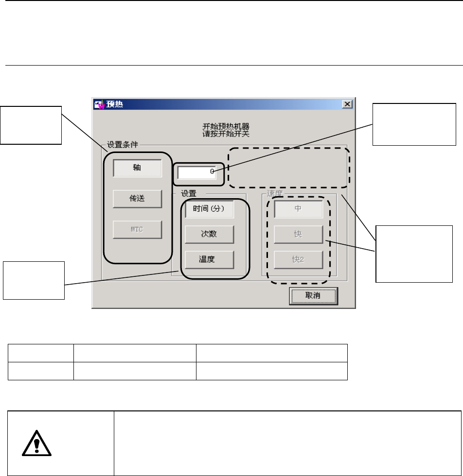 第 1 部 基本篇 第 2 章 生产 2-14 2-4-2 条件设置 (1) 选择预热对象 预热对象,从轴、传送、MTC 中选一(初始设置为“轴” ) 选择一项。 在“机器设置”时,若未在“使用单元”中选择 MTC,则无法选择 MTC。 (2) 选择预热结束的条件 预热结束的条件,可选择时间或次数, 按“时间(分)或“次数”按钮即可(初始设 定为“时间” ) 。 (3)模式设置 在编辑框内输入预热停止的时间、次数或温度。 结束条件,可在…