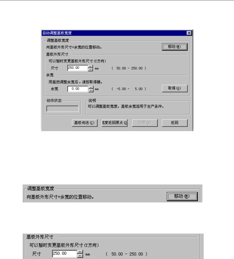 第 1 部 基本编 第 2 章 生产 2- 61 2-10-4 自动调整基板宽度 可进行基板传送宽度的调整。 选择菜单后,显示如下的画面。 图 2.10.4.1 自动调整基板宽度 1) 基板宽度的移动 将传送宽度移动到符合基板外形尺寸+ 余宽的宽度。运行时的传送宽度的值,适用以下项目 的设定值。 图 2.10.4.2 2) 基板外形尺寸 用旋转按钮或输入数值来设定基板外形尺寸。默认值用基板数据的基板外形尺寸(Y)代入。 图 2.10.4…