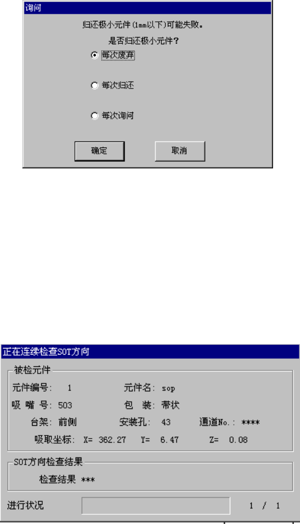 第 1 部 基本编 第 2 章 生产 2- 81 强行中止检查时,请按停止按钮。显示如下信息。单击“是”,中断检查。 图 2.10.6.2.7 检查结束确认 检查结果为“‘OK ’ 以外的错误时”,显示如下的确认。单击“是”,进入单独检查模式。 图 2.10.6.2.8 连续检查错误 指定的全部元件的检查结束后显示如下画面。 单击「确定」。 图 2.10.6.2.9 检查结束