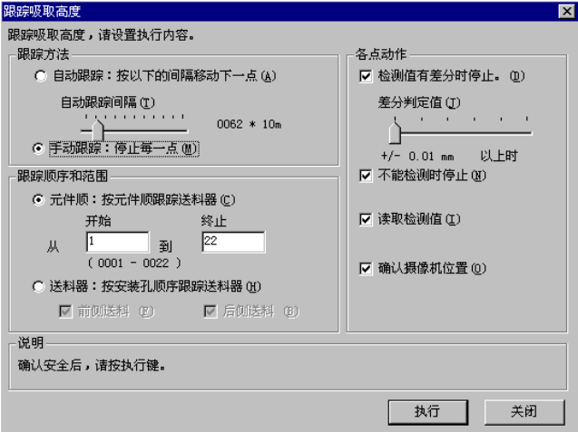 从菜单栏中选择“机器操作”/“确认”/“坐标类”/“跟踪吸取高度”,显示如下画面。