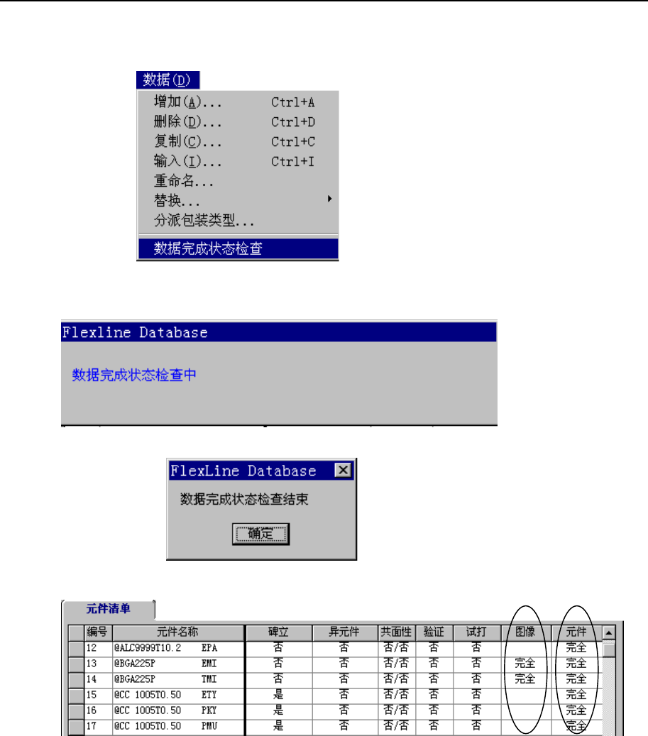 这项功能可对读入 Flexline 数据库的元件及图像数据的完成状态,进行再次检查。