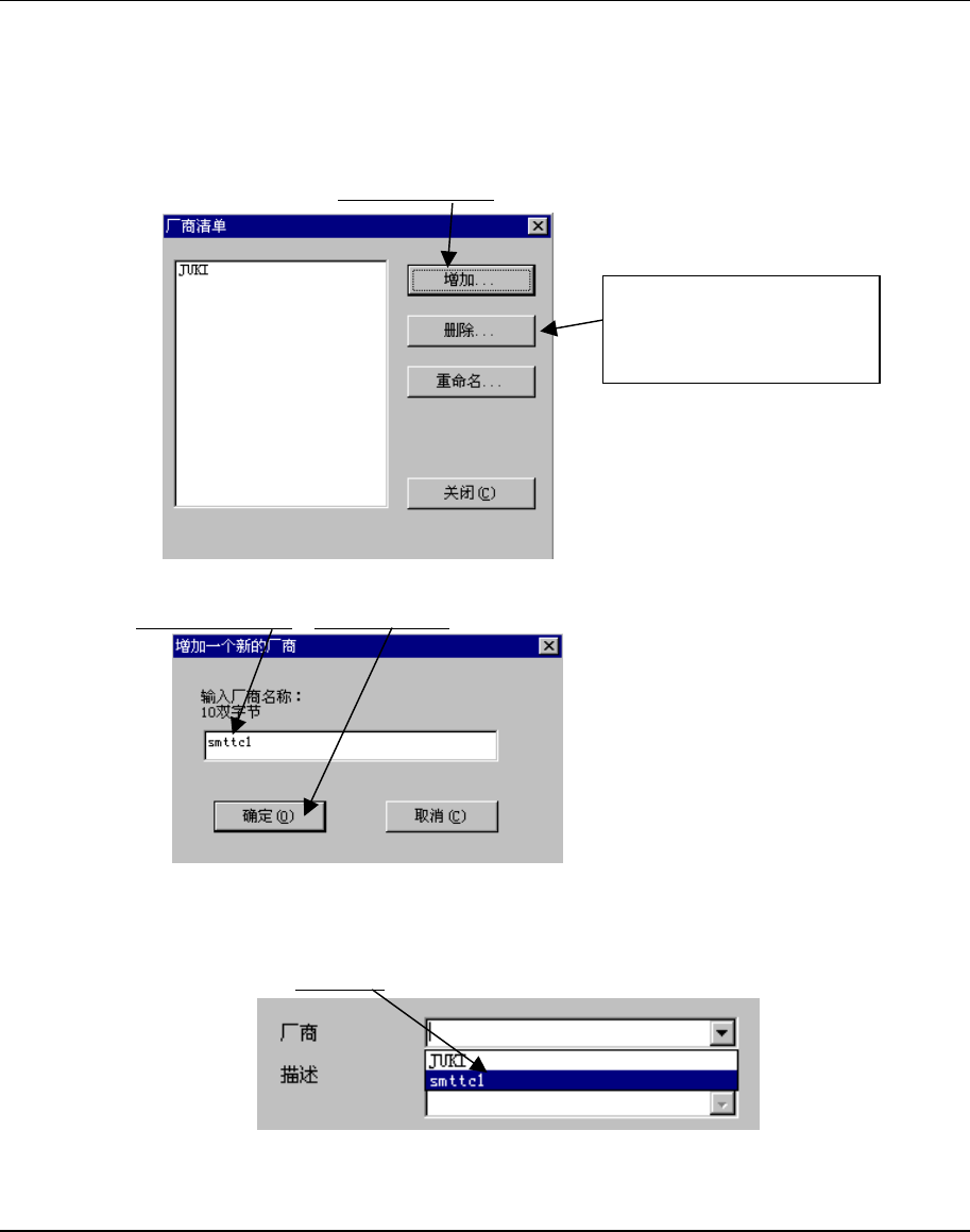 第1部 基本篇 第5章 数据库 5-32 5-6-2 厂商 作为元件数据的参考项目,可显示“厂商名”。 在此制作的厂商名,可从“元件表格”的“厂商”栏的清单中选择。 1) 厂商名的制作顺序 ① 在菜单栏中,单击“工具”/“厂商”。 ② 显示厂商清单画面。单击“增加”。 图 5.6.2-1 ③ 输入新的厂商名 ,单击“确定”。 图 5.6.2-2 2) 厂商名的选择 在元件表格画面上,单击此处 ,从显示的清单中进行选择。 图 5.6.2-…