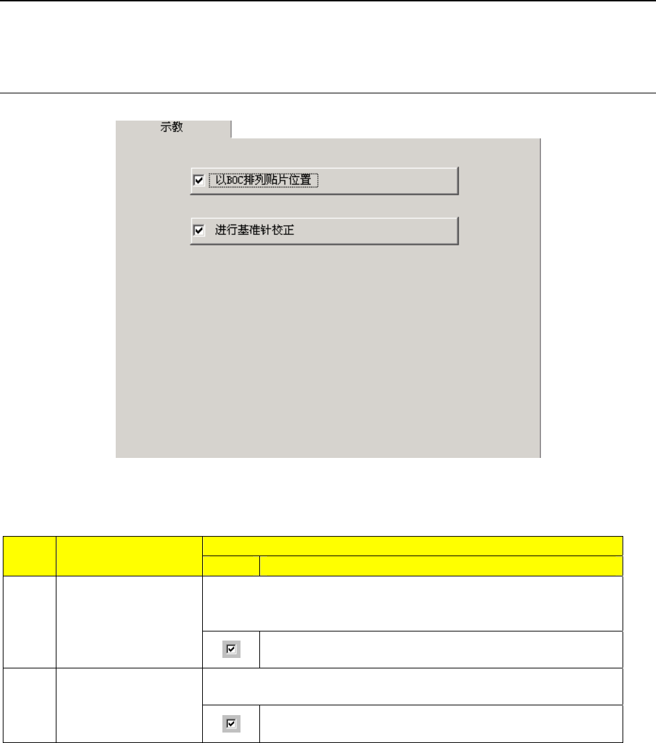 第2部 功能详细编 第7章 操作选项 7-2 7-2 详细设定项目 从主画面的菜单栏中选择[选项]/[操作选项],显示操作选项的设定画面。 操作选项由7项构成,点击画面上方的标签,可切换各项目。 7-2-1 示教 图 7-2-1 示教选项 表 7-2-1 示教选项设定项目的细节和内容 内容 序号. 项目 状态 动作及详细内容 对数据编辑等贴片位置进行示 教时,设定是否进行 BOC 调整(执行 BOC 标记识别,进行内部校正)。 通常…