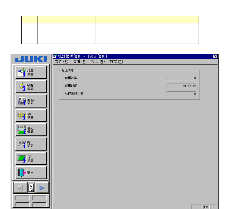第 2 部 功能详细编 第 10 章 设备运行信息 10-24 10-5-12 验证运行信息 (可选) 从菜单栏中选择“窗口(W)”/“其他”/“验证信息”,则显示图10-5-12-1。 No. 项目 内容 1 使用次数 使用验证的总次数。 2 使用时间 使用验证的总时间。 3 验证错误次数 发生验证错误的总次数。 图 10-5-12-1 验证运行信息