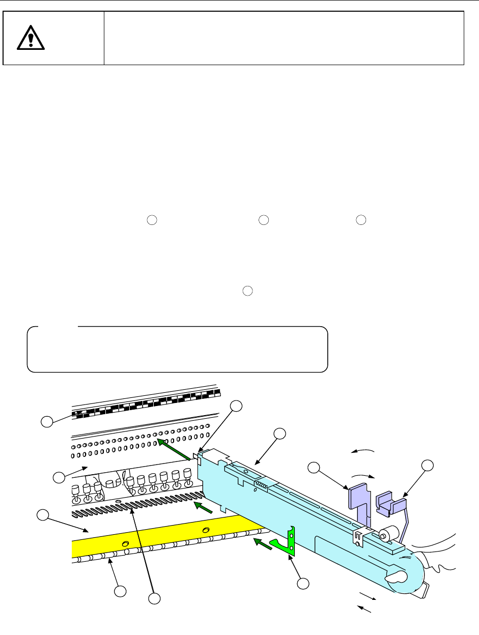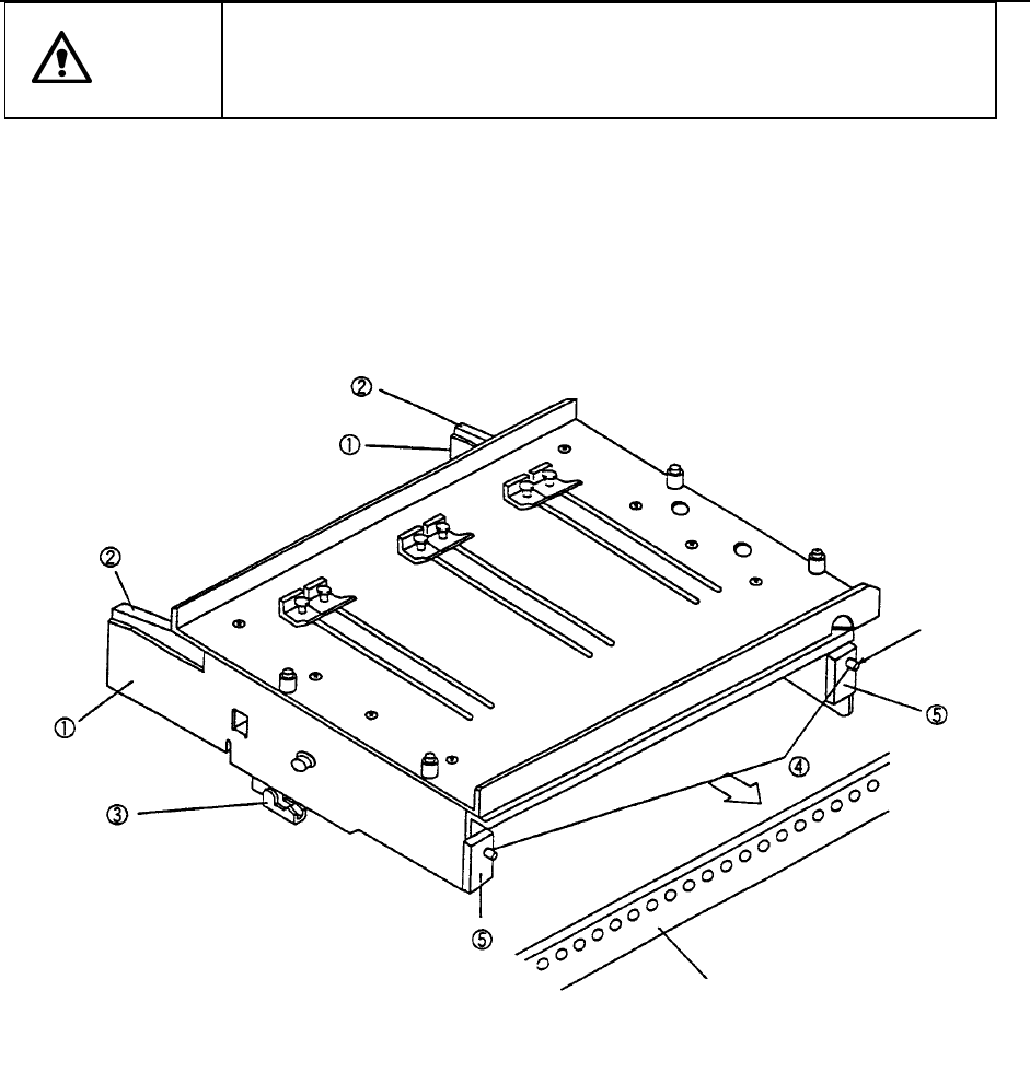 第2部 功能详细篇 第1 2章 选项元件 12-5 12-2 矩阵·托盘支架的更换 注意 如在 XY 轴或贴片头正在动作时更换托盘支架 更换,托盘支架更换可 能会接 触到动作元件,危及人身或损坏装置。 XY 轴和贴片头正在动作时,请决对不要更换托盘支架更换。 请务必打开安全护罩后再更换托盘支架更换。 1) 握住边板①和锁紧杆②,打开锁紧支架③。 2) 在后台的固定板上插入前面的销④。 3) 在销④插入且前板⑤顶住固定板的位置上,放开边板…