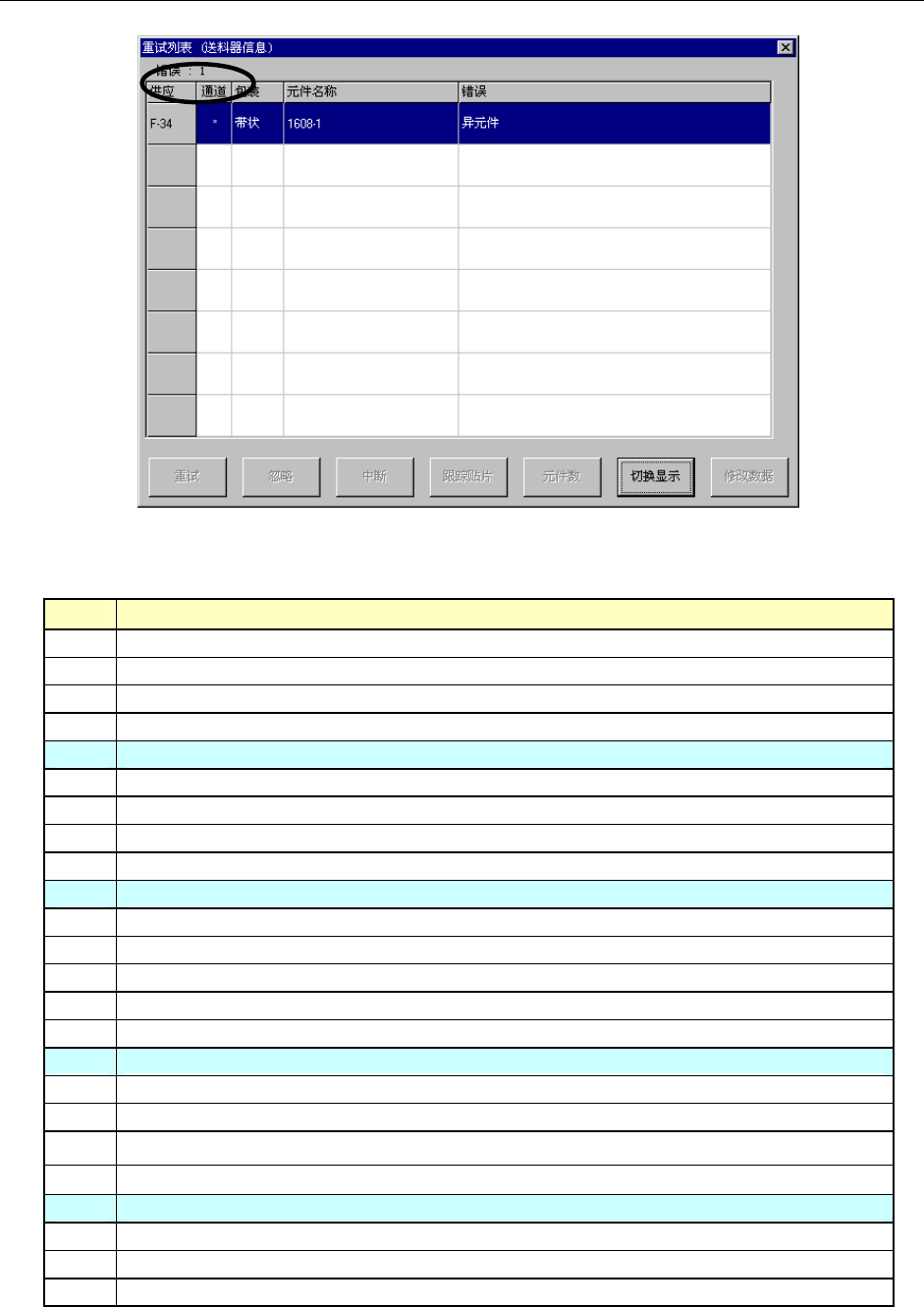 第 2 部 功能详细篇 第 13 章 程序补充 13-35 13-9 生产时出错的详细内容 生产时出错的详细内容。(请参照2-10-5章) ① VCS 识别(仅限于 KE-2060) 值 错误显示内容 20 引脚弯曲 21 引脚长度异常 22 引脚间距异常 23 检测出的引脚比设定的少 24 检测出的引脚比设定的多 25 检测出无引脚 26 检测出引脚为 1~3 根 27 检测出元件架构错误 28 正常间距引脚识别错误 29 检测出的引…