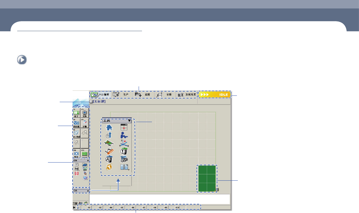 Chap ter 1 本 Chapter 介绍设备、操作面板及 MMI ( Man - Machine Interface )。 设备概要 Advanced Chip Shooter DE CAN S 2 Op er at io n Ha nd bo o k 1-3 M MI 构 成 画面 > 基本MMI的构 成画面 MMI 构成画面 1. 基本 MMI 的 构成 画面 显示 HEAD 的喷嘴信息 Shortcut bar 主菜单…
