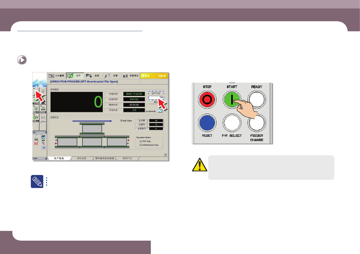 DE CAN S 2 Op er at io n Ha nd bo o k 3 -2 1 Chap ter 3 本 Chapter 主要介绍生产作业顺序 生产 Advanced Chip Shooter 生产 > 作业时 间 (生产 指定 数量 ) 生产 ㆍ 按< ST ART >按钮恢复生产。 警 告 必须确认设备周围是否有工作人员后开始生产 3. 作 业 时 间( 生 产 指 定 数 量 ) Step 1. 输入生…