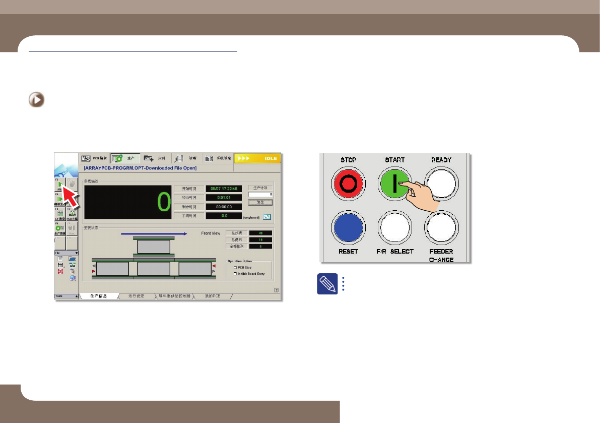 生产过程中的检验事项 Chap ter 4 Advanced Chip Shooter DE CAN S 2 Op er at io n Ha nd bo o k 4-1 1 本 Chapter 主要介绍检验生产中错误或其他事项并采取措施时的设备暂停方法(继续/开始 模式) , 异常停止方法( 人为/系统异常停止) , 异常停止后系统重启方法等 暂 停 > 开 始模 式 : 错误发生后恢复生产 的方法 暂停 Step 2. 错误 …