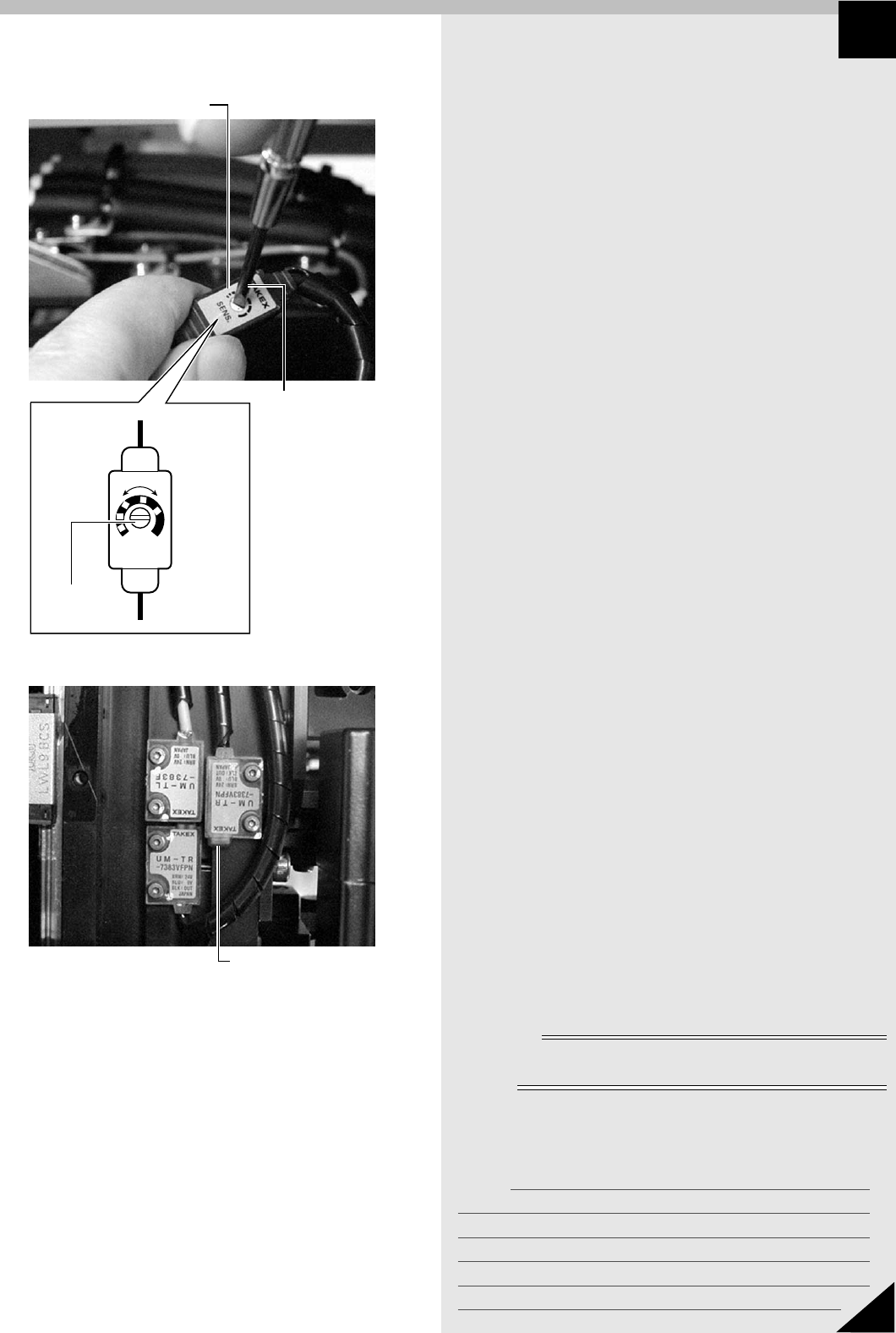 メモ 32 1 Section JMC9016121 8. ヘッド下降域センサーの交換と調整 ■ センサー交換後のアンプ調整 センサー交換後、センサーアンプを調整します。さらに、 専用治具を使用して、各センサーの取り付け高さを確認し ます。 1 アンプのボリュームを最大にして、センサー L E D の点灯を確認します。 アンプのボリュームを最大にしたときに、センサー ( 受光側) の緑と赤の L E D が点灯することを確認して くださ…