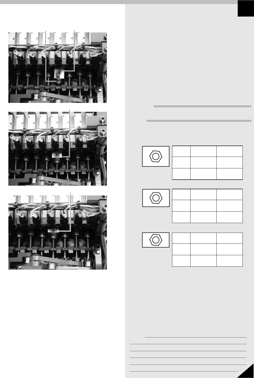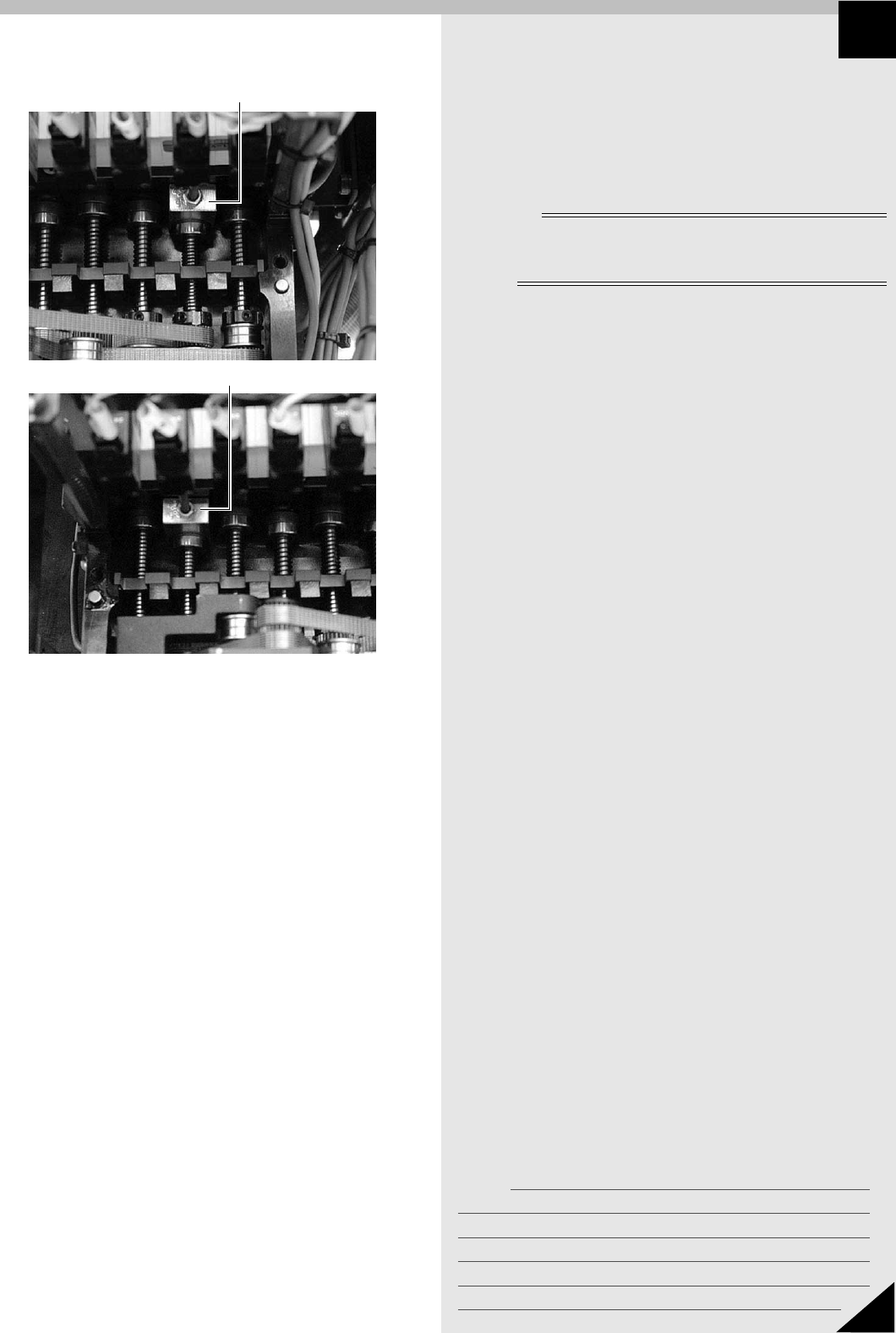 メモ 35 1 Section JMC9016121 8. ヘッド下降域センサーの交換と調整 5 ヘッド 2 と 7 でのセンサーの動作を確認しま す。 ヘッド 4 と 5 の各センサーの動作を確認したら、同 じ要領でヘッド 2 と 7 での各センサーの動作状態を 確認してください。 参考 ヘッド1と8 は、構造上、専用治具をセットできないため、ヘッド2 と7の各センサーの正しい動作状態が確認できれば問題ないと判断し ます。 ■ その他…