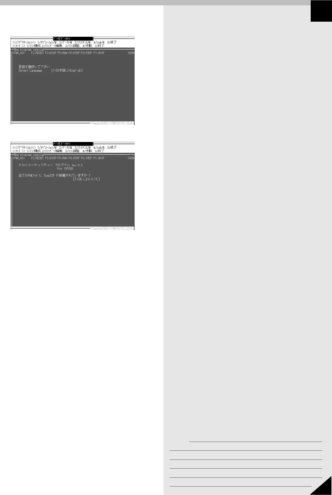 メモ 39 1 Section JMC9016121 9. FNC ヘッド初期位置調整 ■ F N C ユーティリティープログラムの起動 1 選択されているノズルを確認します。 F N C ヘッドに Type72F ノズルが選択されている ( 下 を向いている) ことを確認しておきます。 参考 Type72Fノズルが下に向いていない場合は、次のようにします。 1. 「3/4/A1 入出力モニター」でヘッドを下降させます。 2. 非常停止…