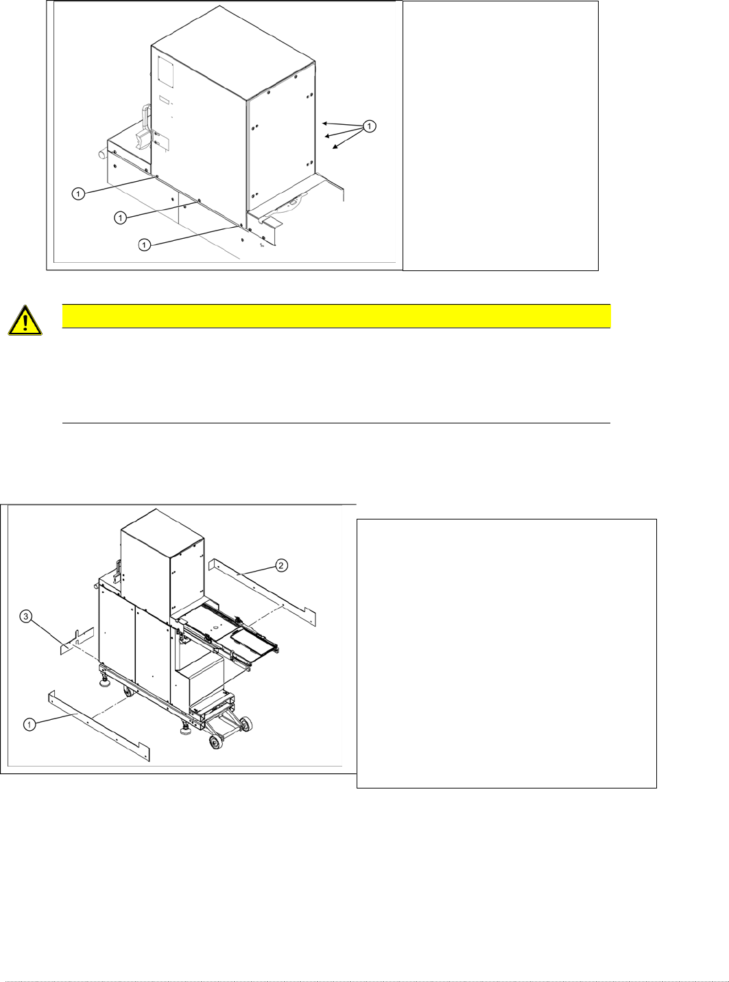 维修手册 WPC5 / WPC6 第 3 页 - 11 警告 !不能用锁紧漆打开螺丝! 塔在出厂时用这 6 个螺钉 (1) 固定。 如果打开这些螺丝, WPC 必须由 SIPLACE 服务部门重新调整,或送回 ASM 进行维修。 底盖板 如果 WPC 配置为高机器高度,额外的盖板将连接 到底座。 1. 右盖 2. 左盖 3. 封面 在执行维修工作之前,您可能需要取下这些盖 板。 螺丝用锁定清漆密封在塔 上。