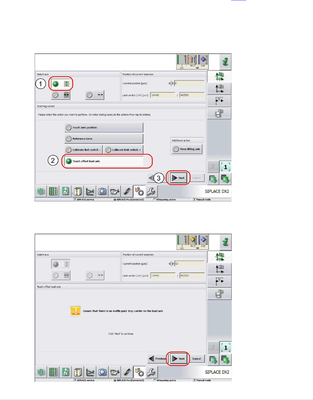 维修手册 WPC5 / WPC6 第 4 页 - 120 4.1 .5 示教负载轴偏移 点 如果您已经更改了零点位置,则只需 示教偏移点(参见 “ 4.1.2 示教零点位置 ” [ ➙ 4-115 ] ). 从 WPC 中取出所有华夫饼包装托盘托架 (WPTC) 。 选择提升轴 (1) 。 选择功能 Teach offset load axis (2) 。 选择下一步 (3) 。 按照显示的说明进…