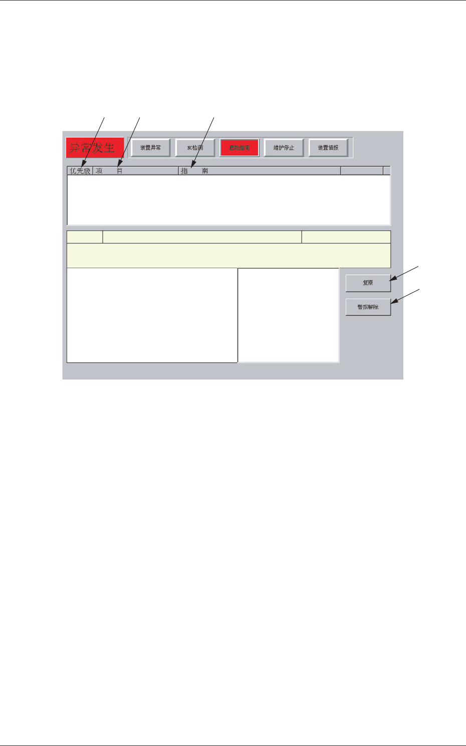 2 - 7 1.1 异常显示界面 1.1.4 维护停止界面 • 界面显示 在“异常显示”界面,按[维护停止]按钮,显示以下界面。 Fig.4B5 • 界面构成 [1] 时 间 显示维护停止发生的日期和时间。 [2] 项 目 显示维护停止项目。 [3] 内 容 显示维护停止内容。 [4] [复原]按钮 按此按钮,解除异常音和异常显示。 [5] [警报解除]按钮 按此按钮,只解除异常音。 0 70 3 - 00 1 [1] [2] [3] …