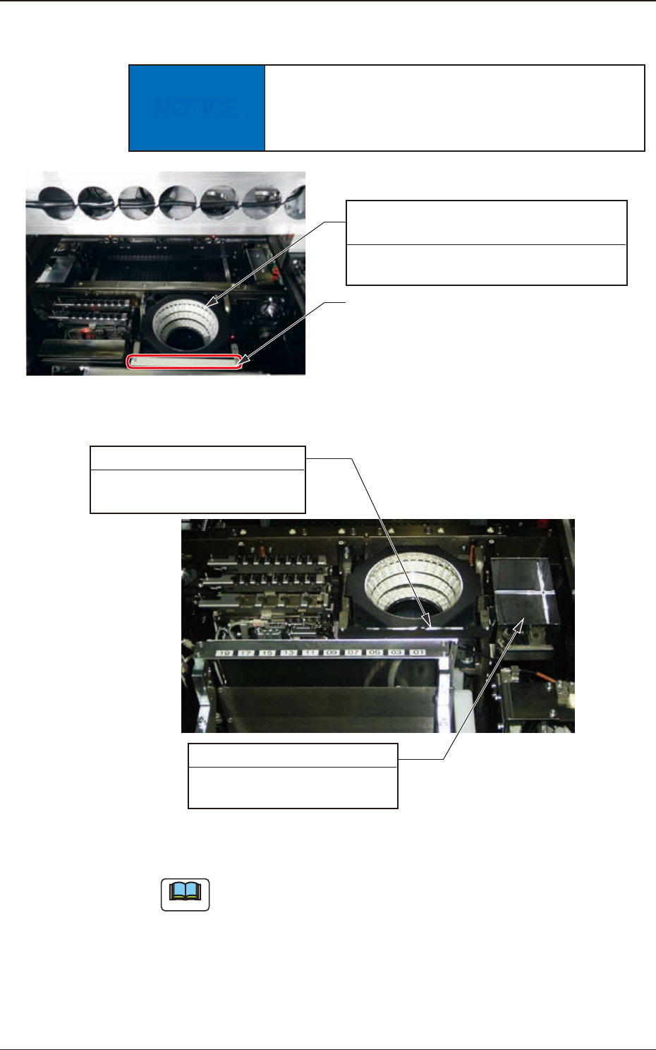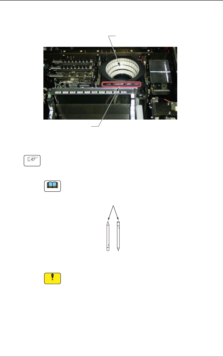 4OM-1840 1-4-10 1604-001 4.3 Component Recognition Camera Section NOTICE Do not put your hand onto the ducial mark block. If too much force is given to the ducial mark block it may become deformed. Fiducial Mark Block …