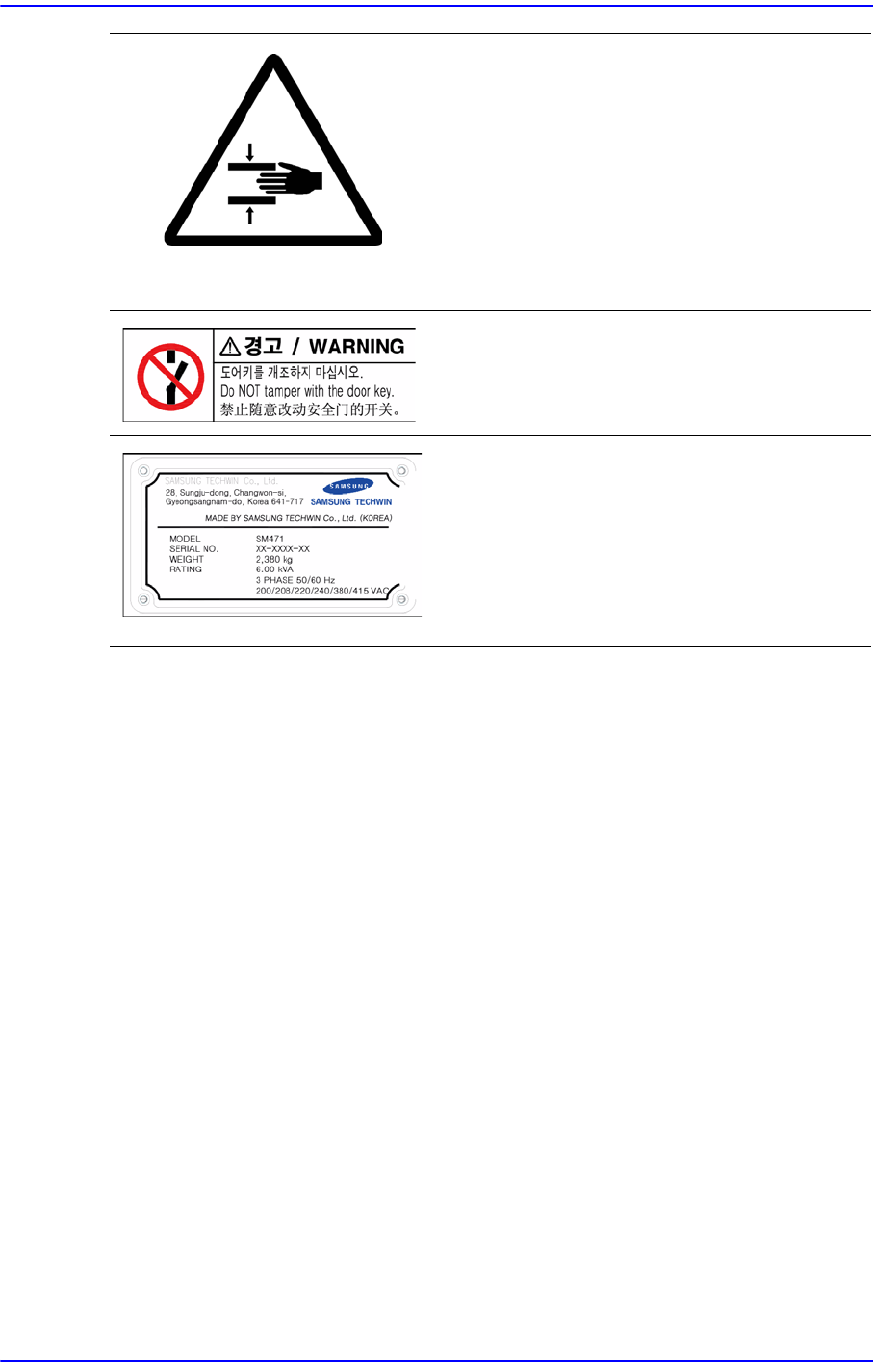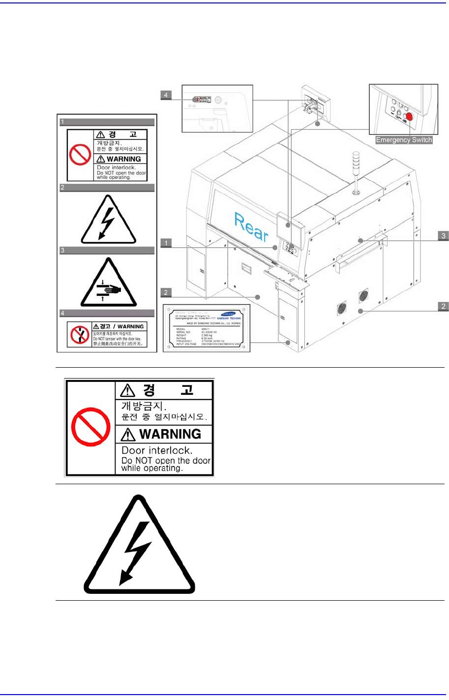 머리말 v 장비 후면 장비의 후면에는 다음과 같은 라벨들이 부착 되어 있습니다 . 그림 2.2 장비 후면에 부착된 안전 라벨 운전 중 도어를 열지 말 것 . 이 라벨이 부착되어 있는 곳은 이동체가 내 장되어 있으므로 구동 중 커버를 열고 신체 의 일부를 장비 내부로 집어넣을 경우에 대 단히 위험합니다 . 커버 내측이나 스위치 부위에 고전압이 흐르 고 있으니 감전에 주의하시기 바랍니다 . …