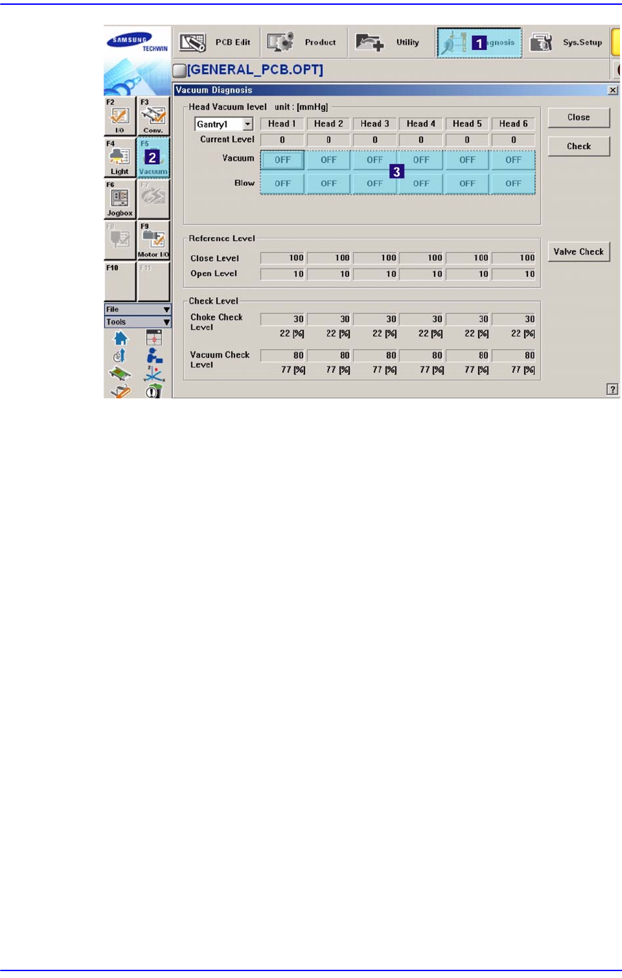 Vacuum 센서를 확인하고 Diagnosis 메뉴의 Vacuum 에서 에러가 발생된 헤드에