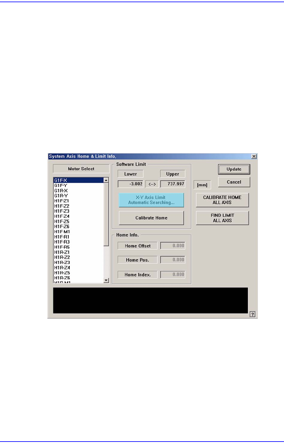 ‘SystemSetup’ 메뉴에서 ‘Calib’ 보조메뉴를 선택하고 <Axis Home Calibration>