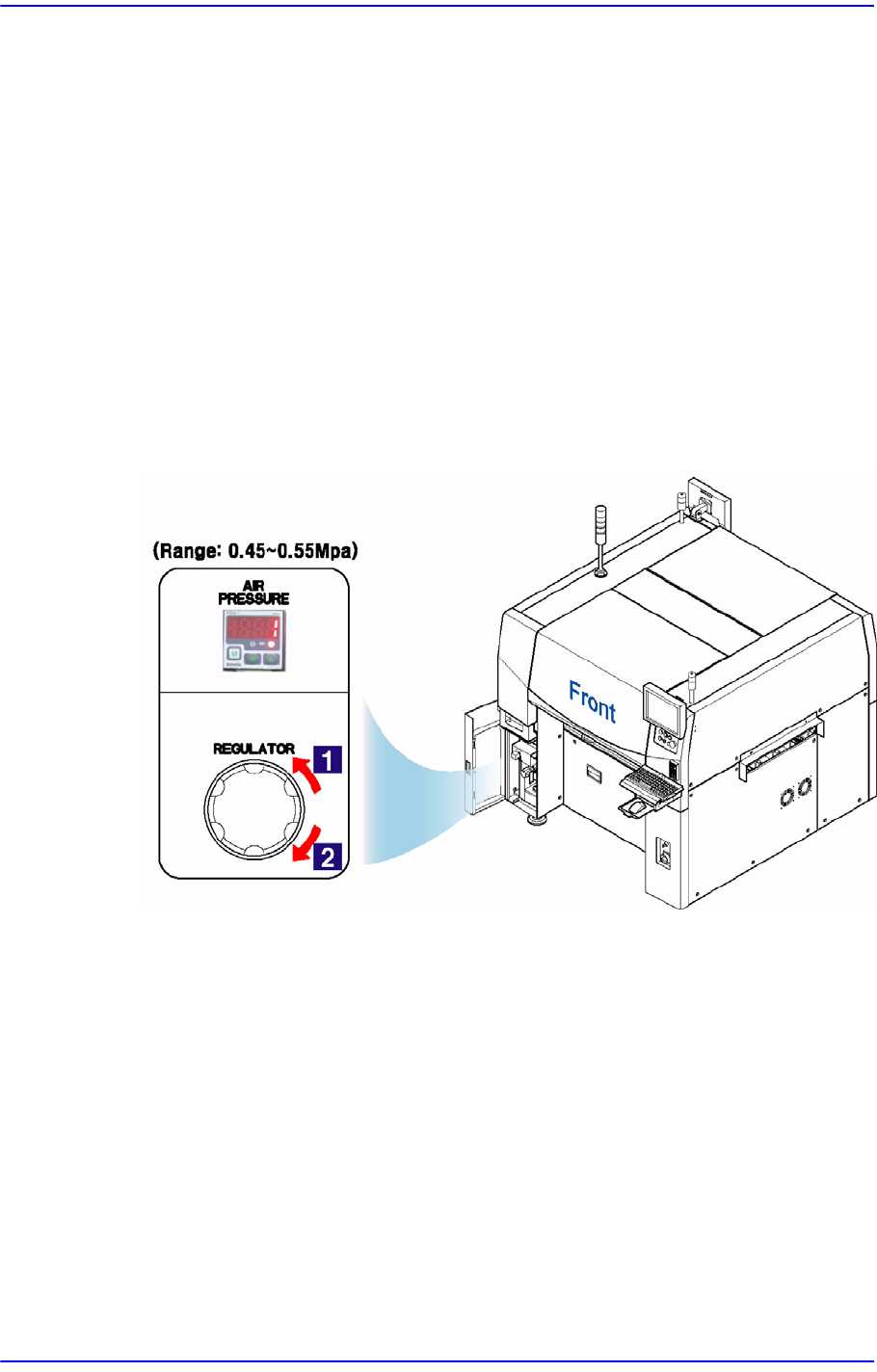 전면의 공압 게이지(Air Pressure)에서 공압이 정상적(0.45-0.55Mpa)으로 공급되